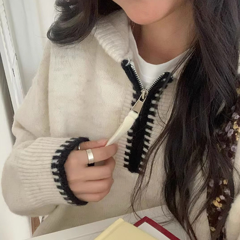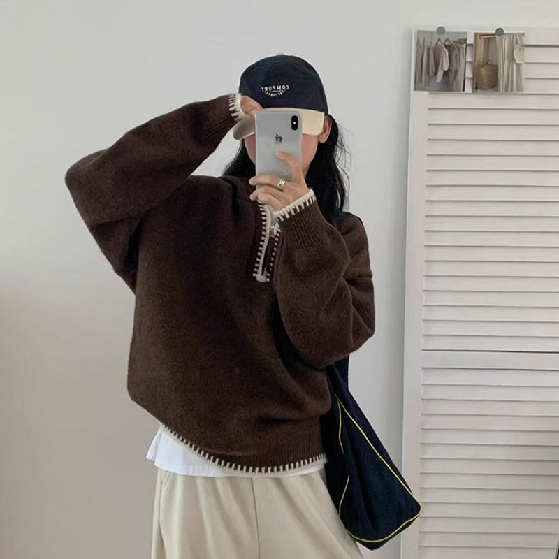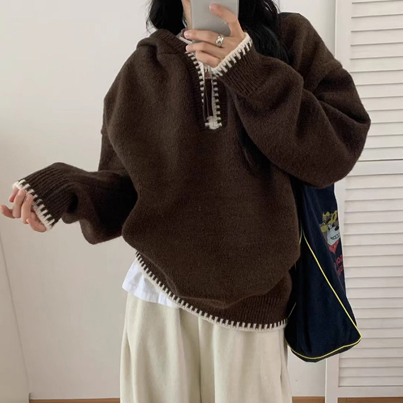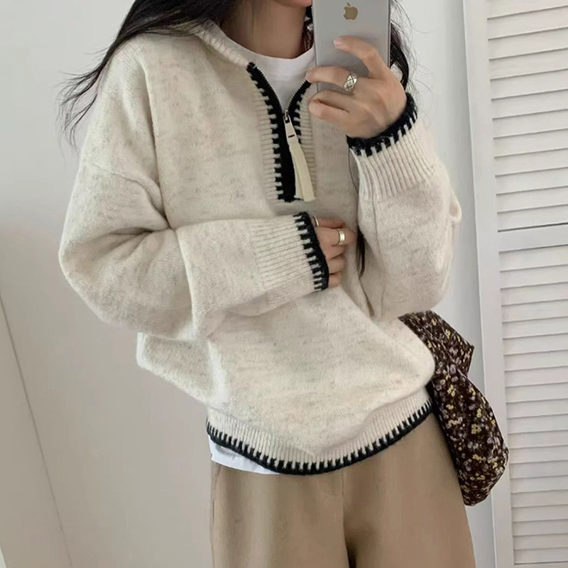 美式复古白色半拉链连帽毛衣女秋冬老钱风宽松套头针织帽衫上衣厚