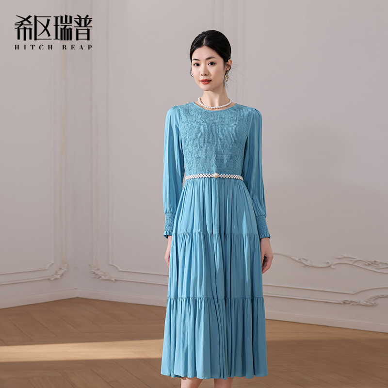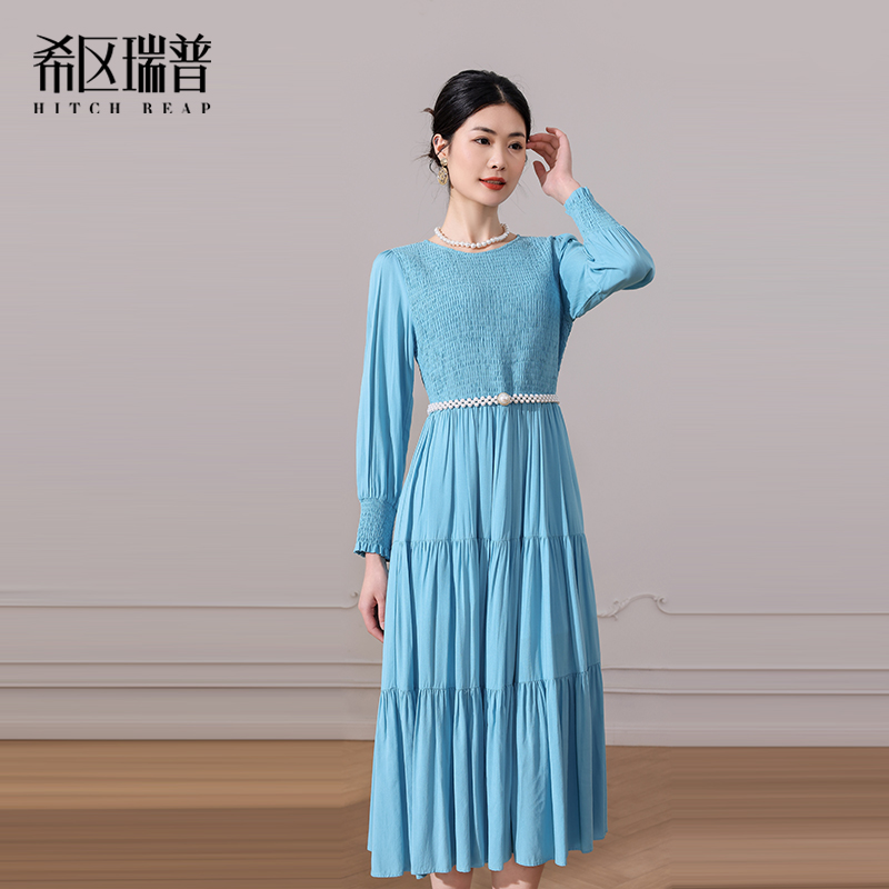 希区瑞普优雅浪漫连衣裙女春夏新款气质显瘦修身长袖纯棉长裙子