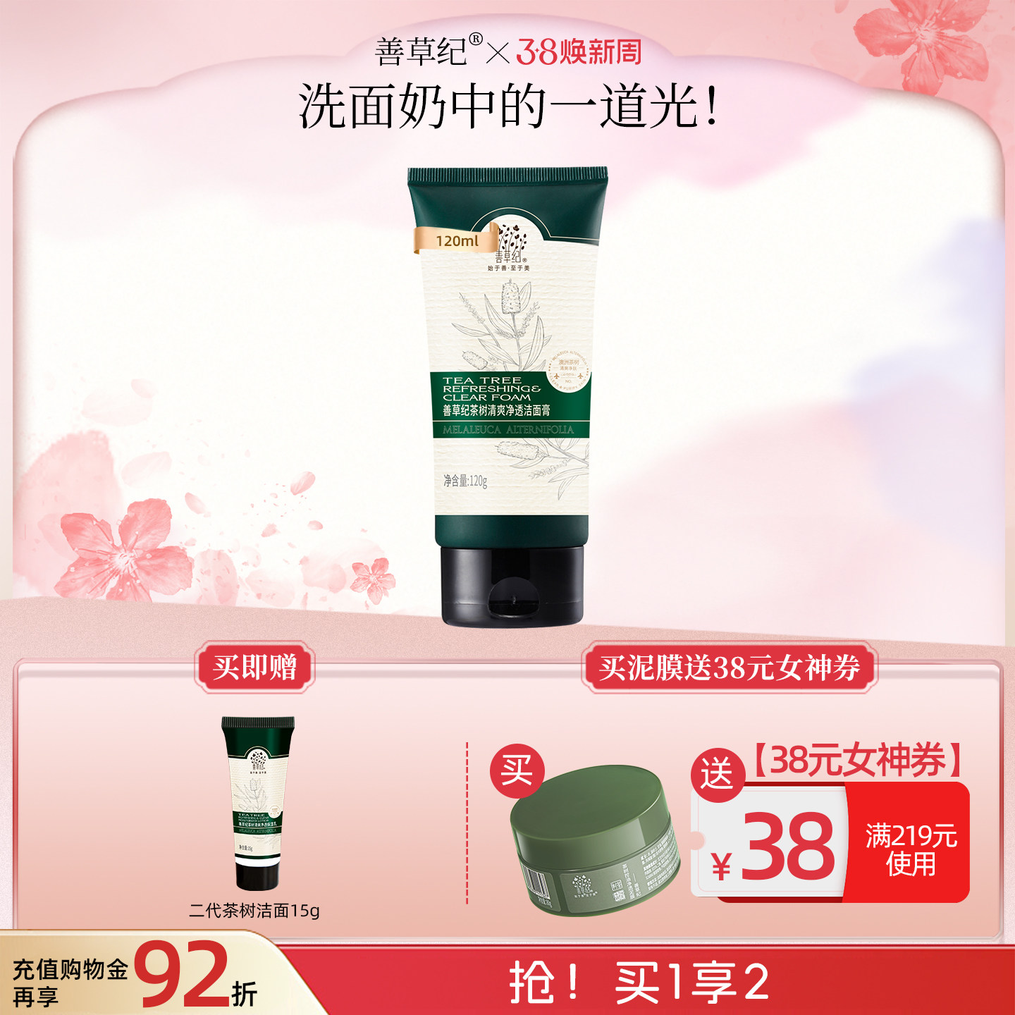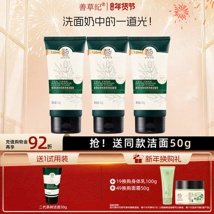 善草纪善草纪二代茶树洁面女男补水清洁毛孔控油洗面奶学生护肤品