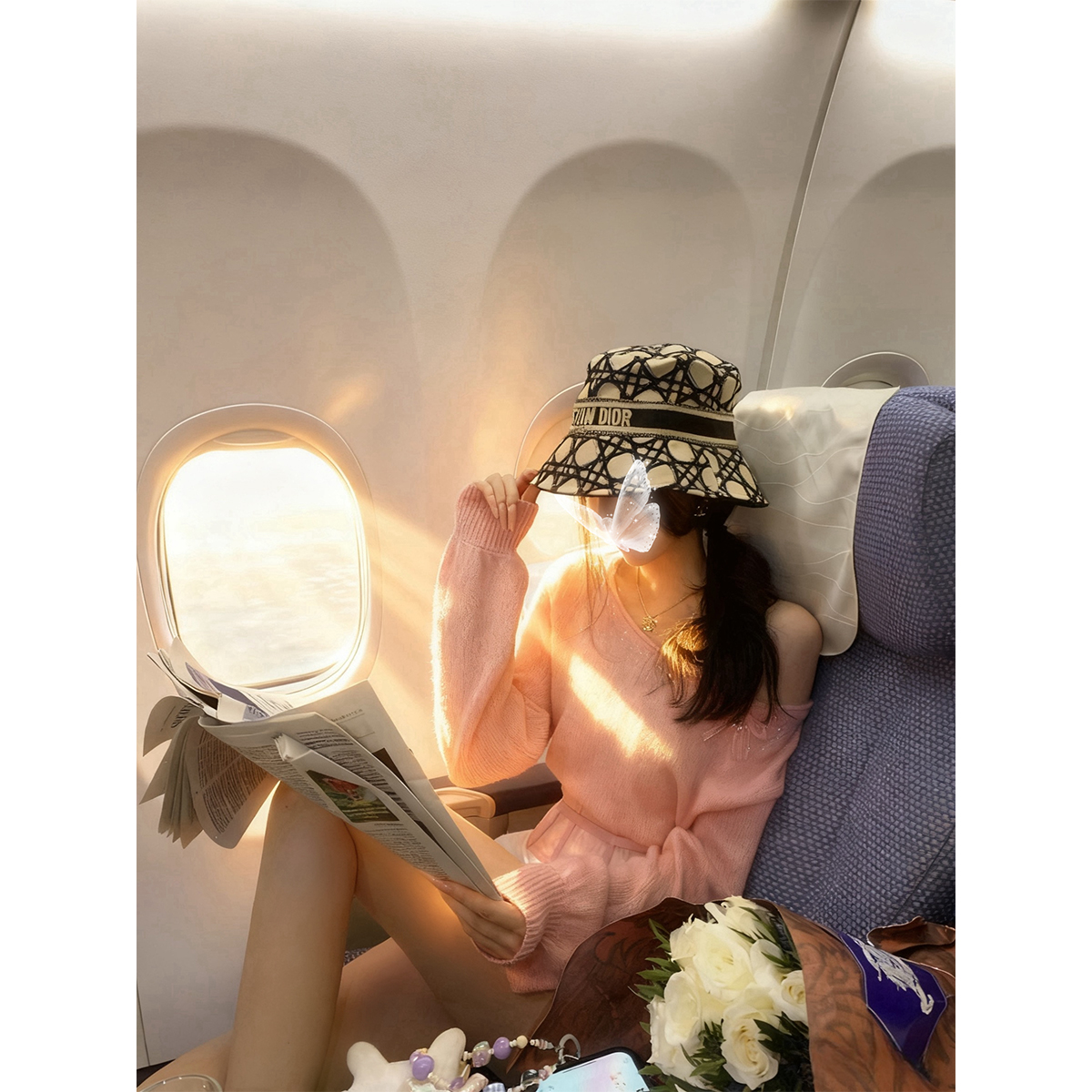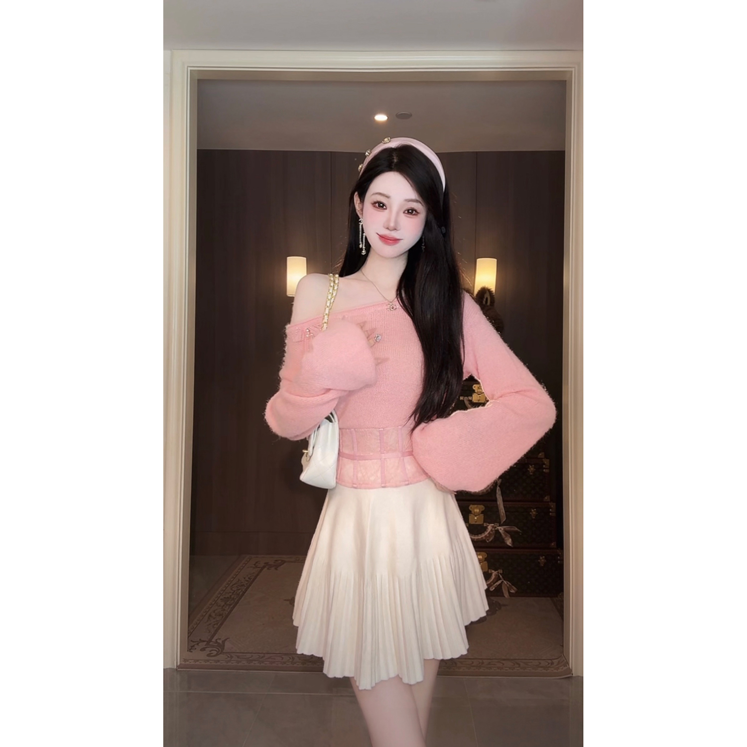 Sun雅乔【心动猎手】宽松落肩蕾丝腰封粉毛衣女套头