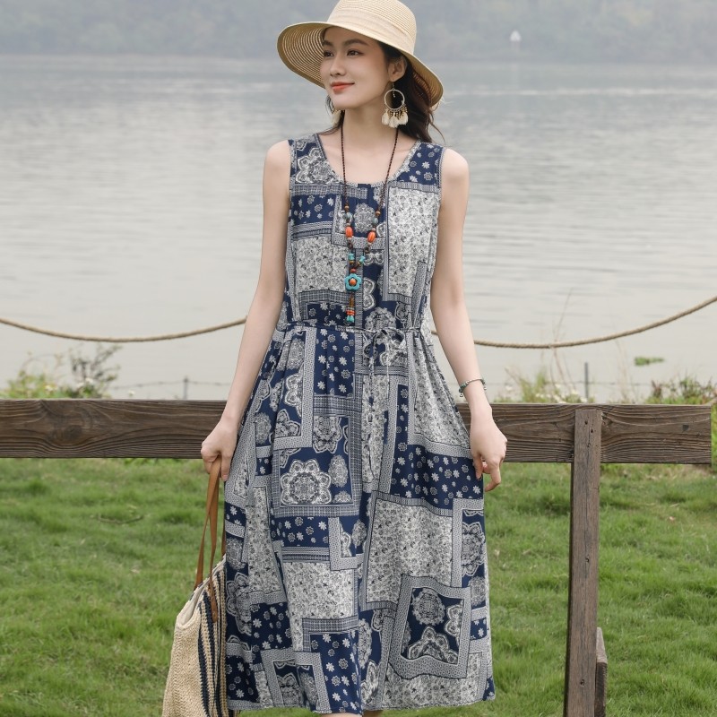 2025新款大码中年人造棉绸连衣裙女夏海边背心睡衣妈妈大长裙外穿