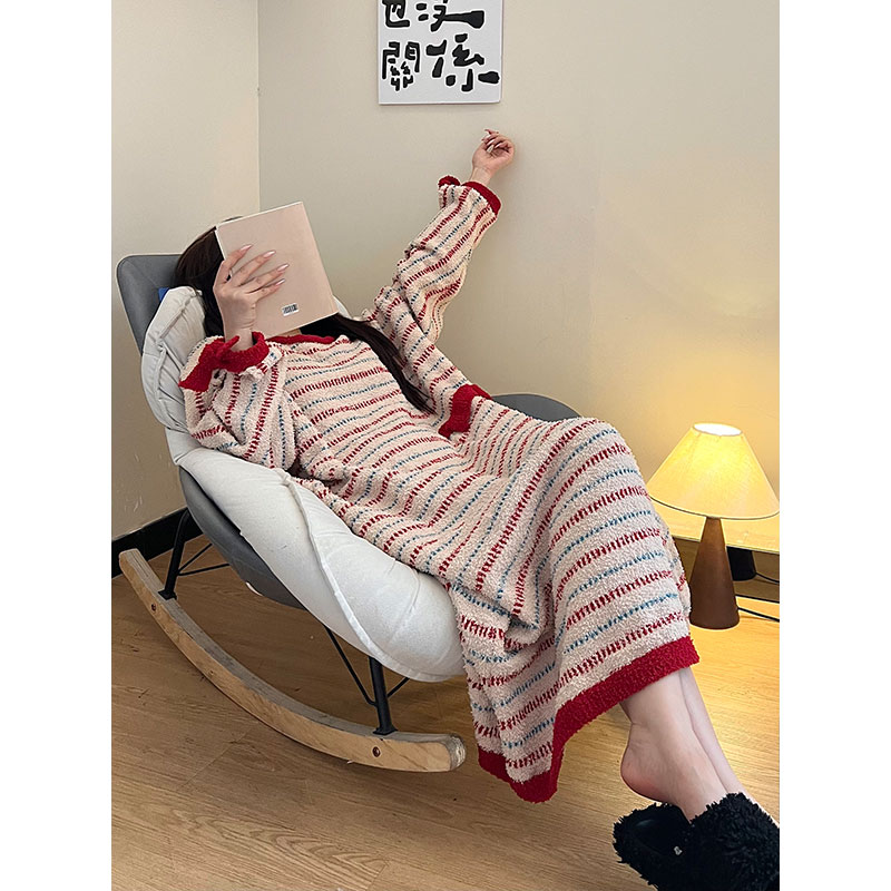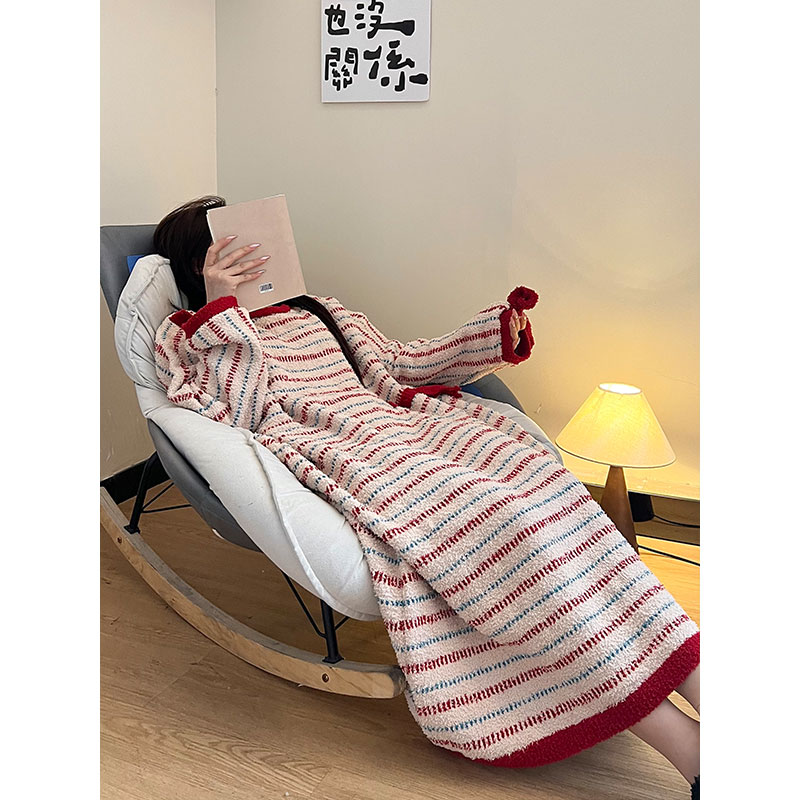 日系甜美条纹长袖半边绒睡裙女2025秋冬季大码加厚可外穿家居服