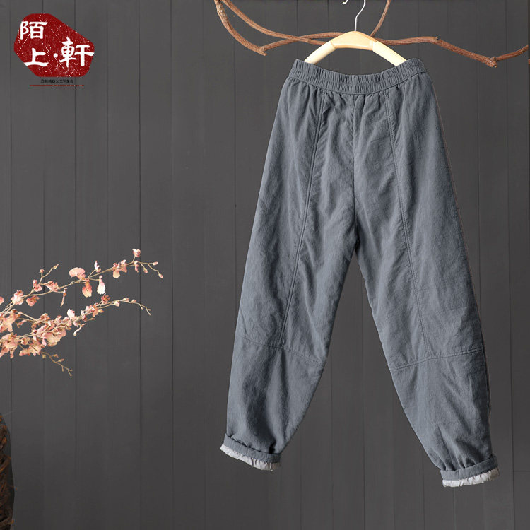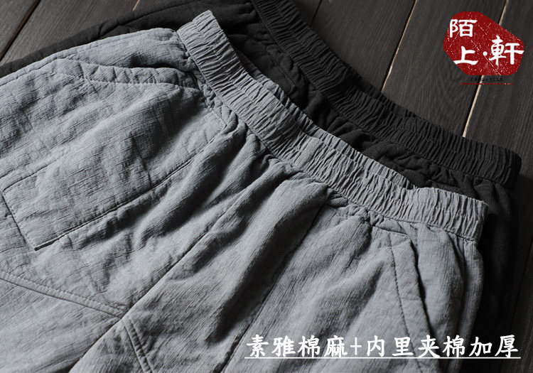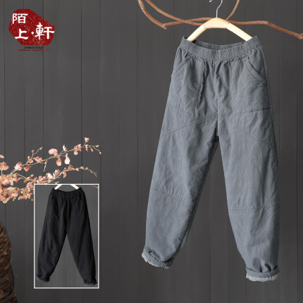 文艺素雅棉麻纯色裤子女冬季夹棉加厚长裤宽松显瘦棉裤小脚萝卜裤