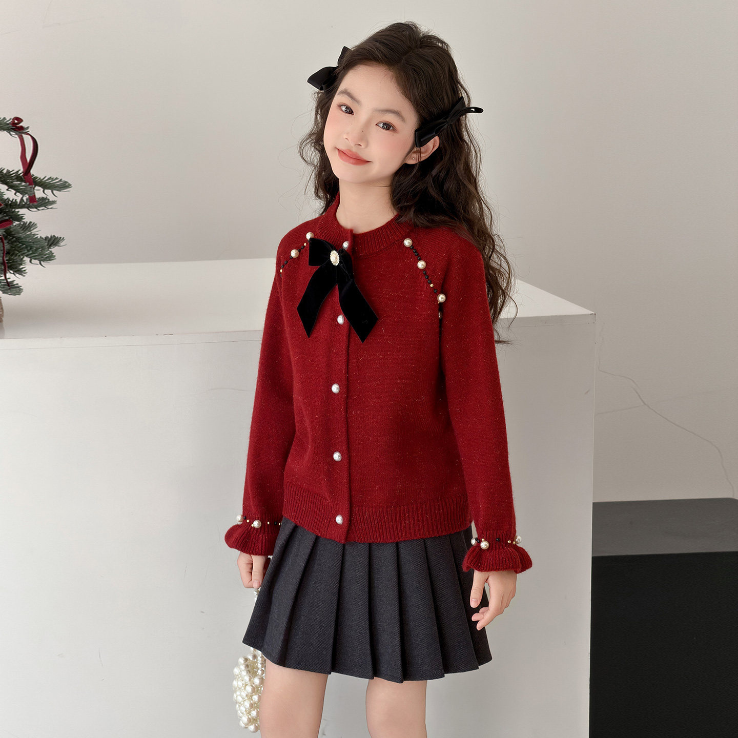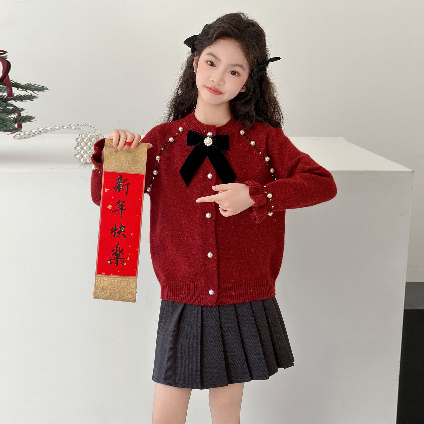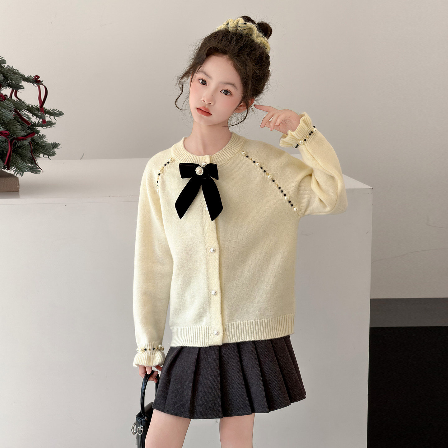 女童小香风蝴蝶结珍珠针织开衫秋冬高级感毛衣百褶裙两件套女大童