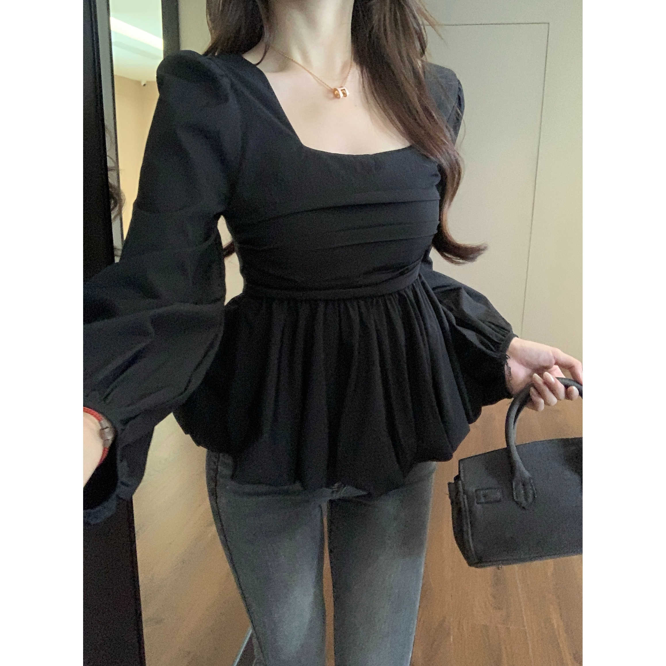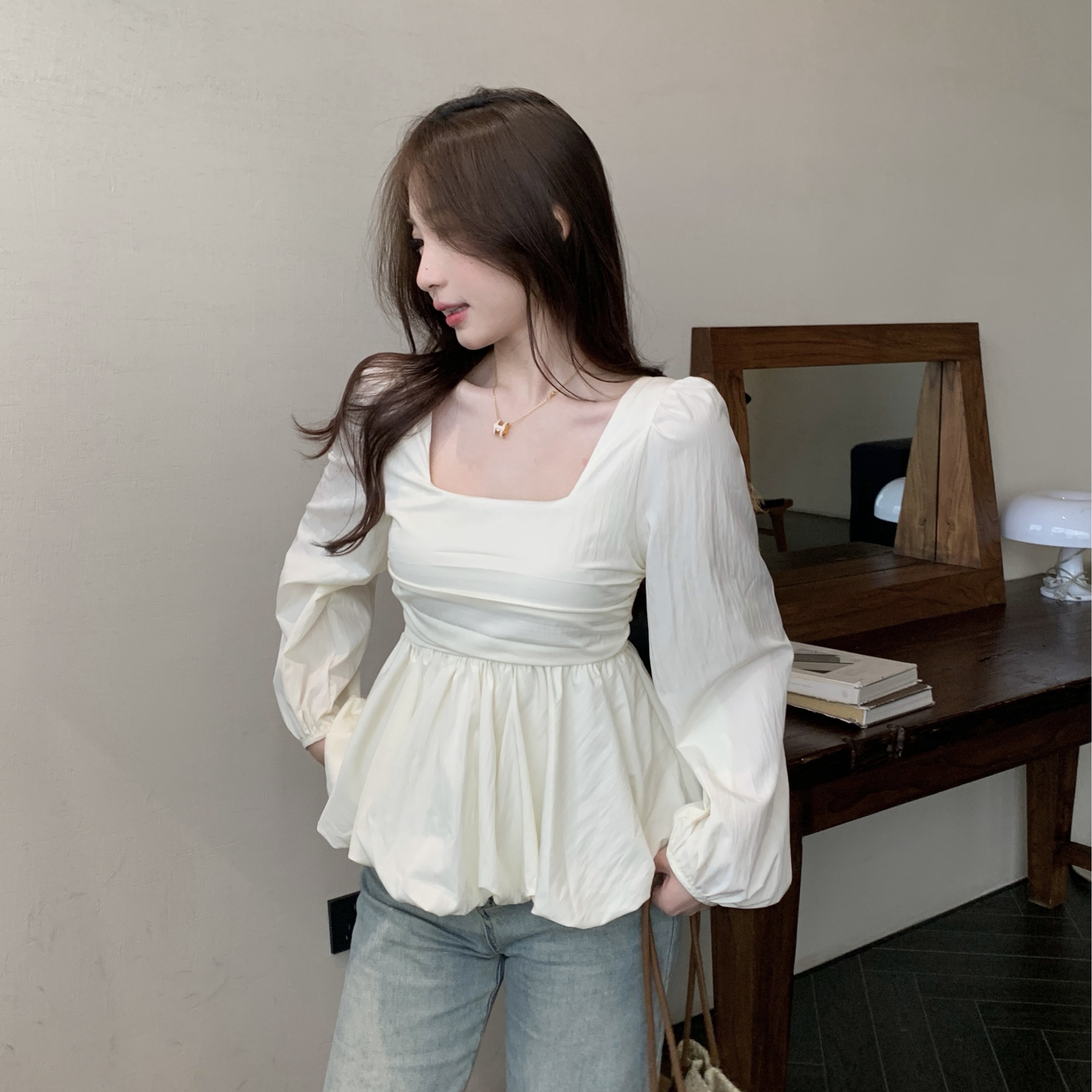 大码胖mm法式独特锁骨方领长袖衬衫女秋新款收腰遮肚洋气小衫上衣