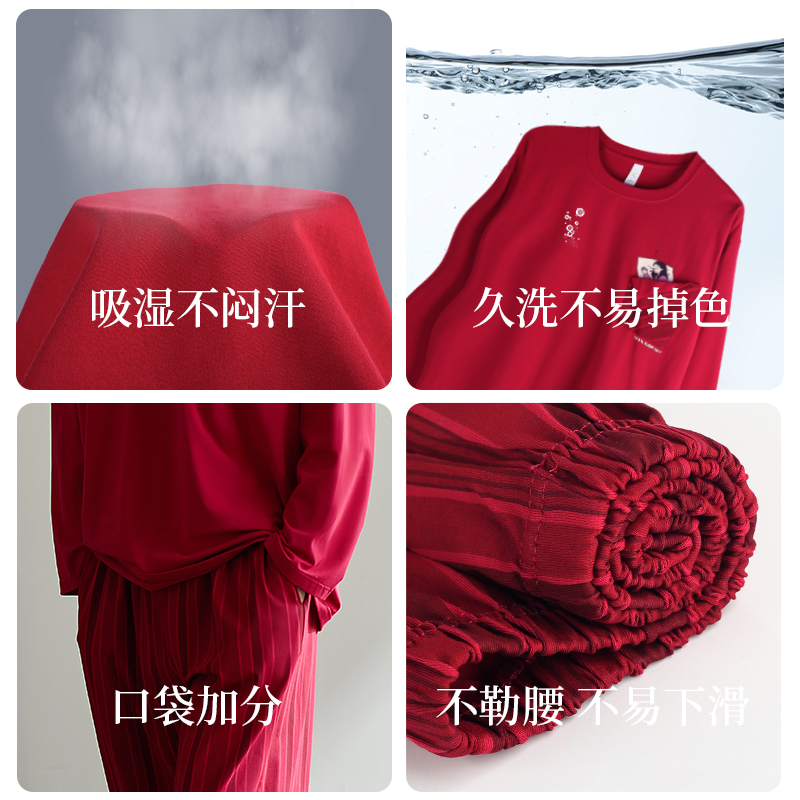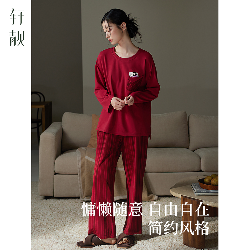 轩靓情侣睡衣女春秋季秋款纯棉长袖红色男士家居服大码套装
