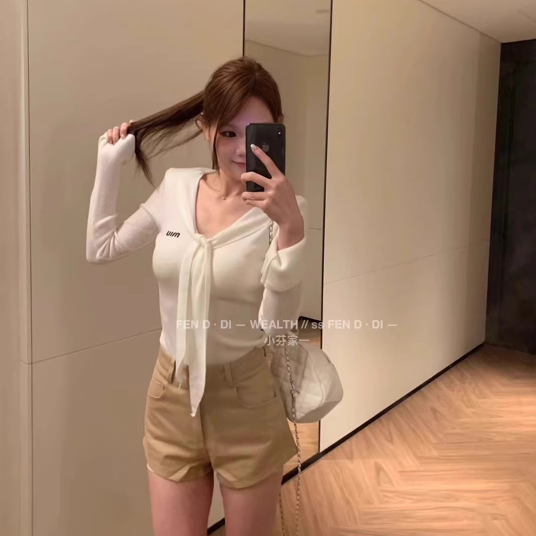FEN秋冬小资腔调气质穿搭V领垫肩收腰围巾领显瘦针织衫打底内搭
