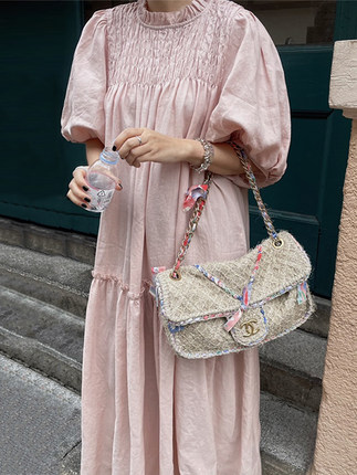 韩国chic夏季甜美慵懒风立领褶皱设计宽松休闲木耳边短袖连衣裙女
