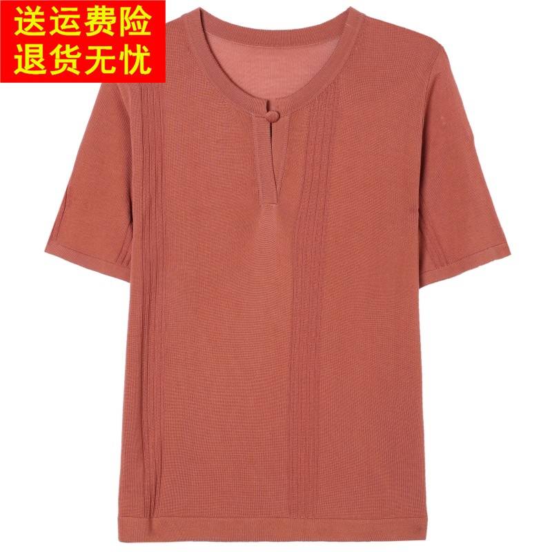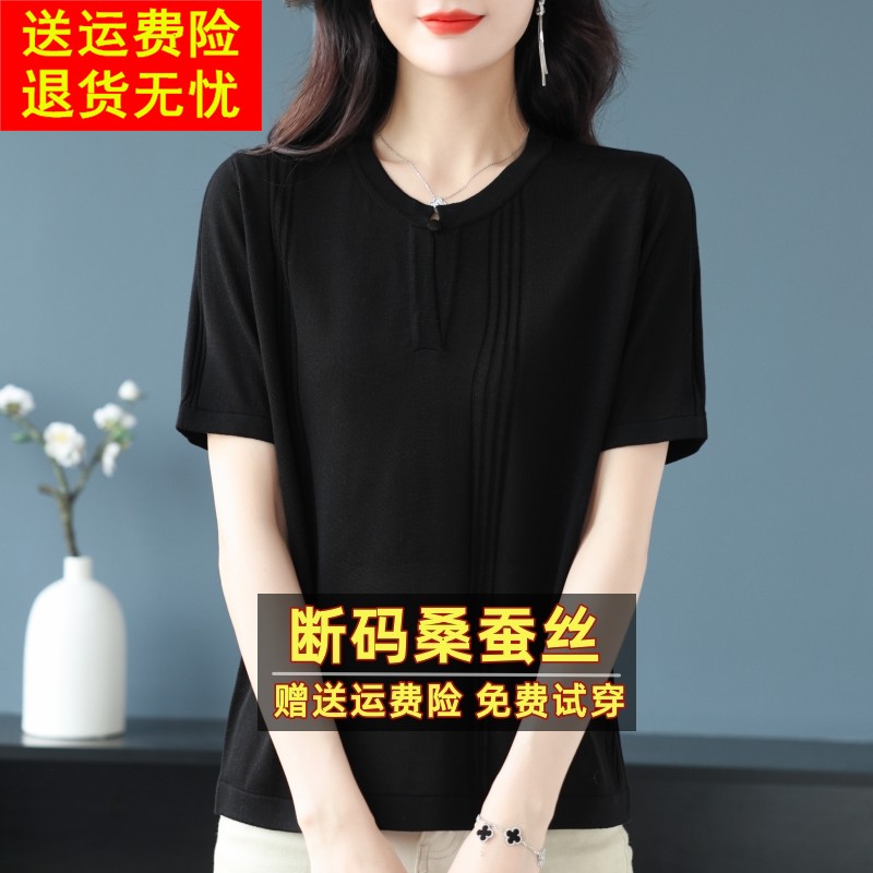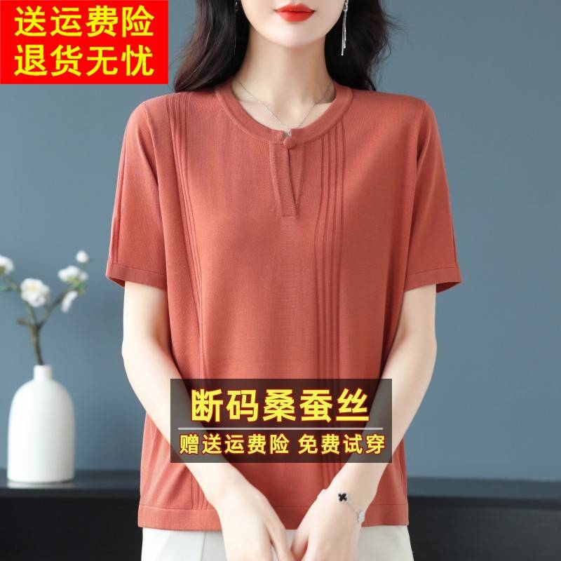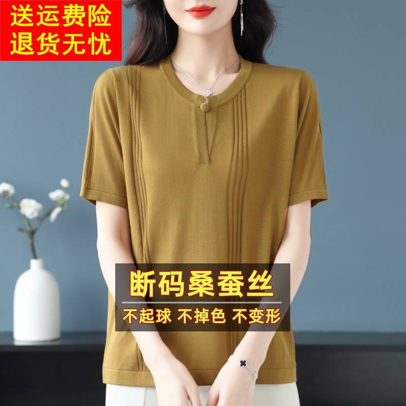 妈妈夏装新款桑蚕丝短袖t恤女上衣宽松遮肚洋气减龄冰丝针织小衫