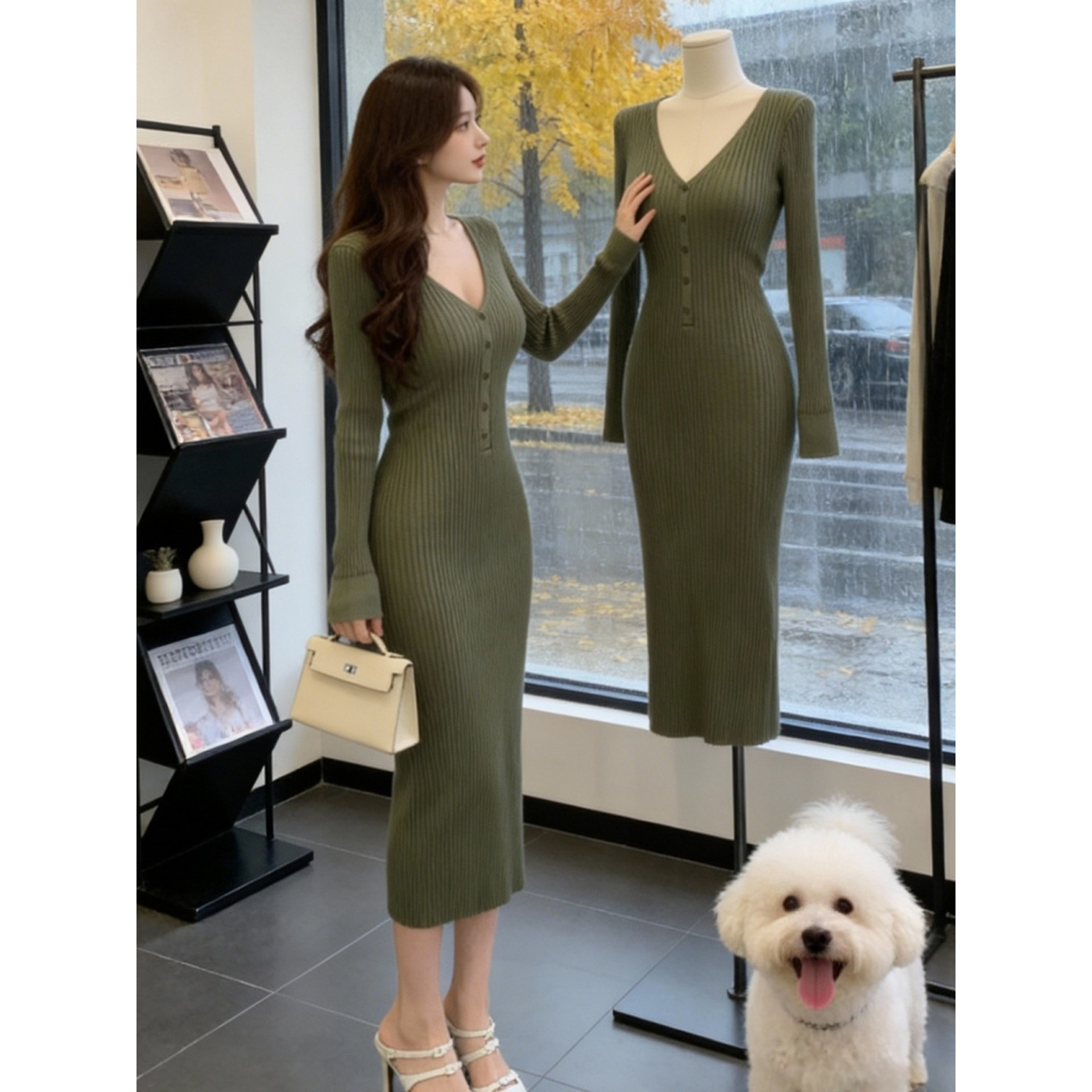 韩国轻熟优雅风V领针织连衣裙女早春新款设计感修身显瘦气质长裙