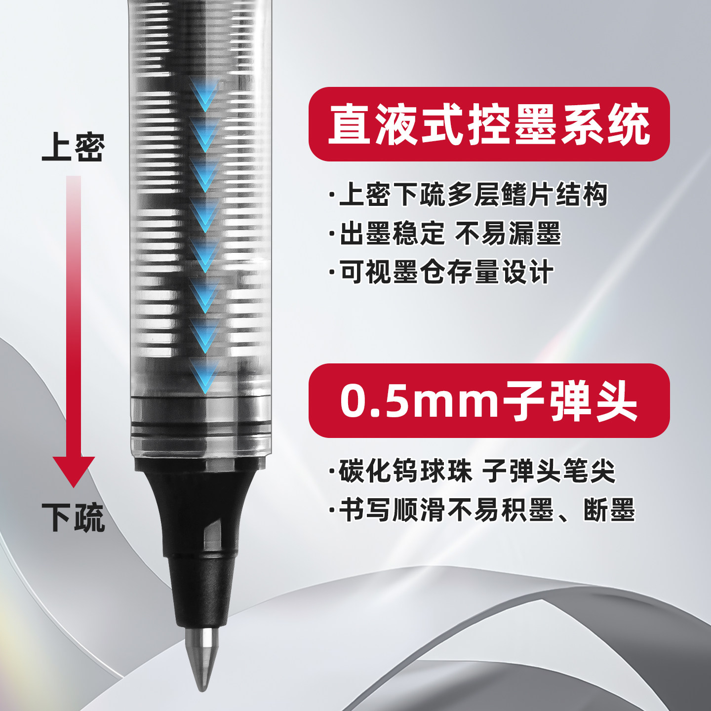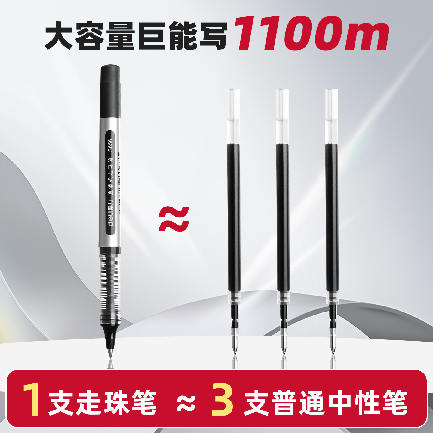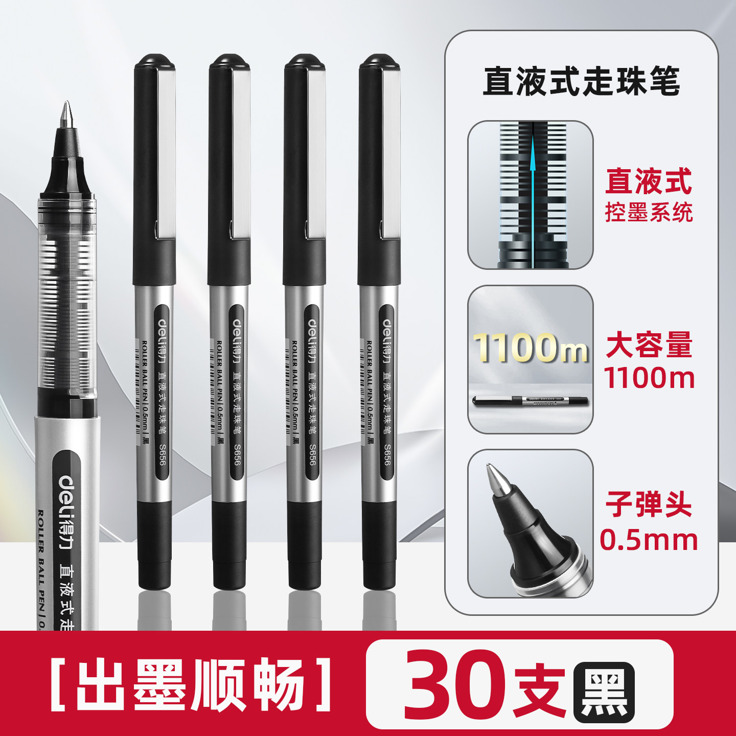得力直液式走珠笔中性笔学生用0.5黑色签字笔圆珠笔全针管水笔直液笔水性笔商务简约办公大容量速干油墨