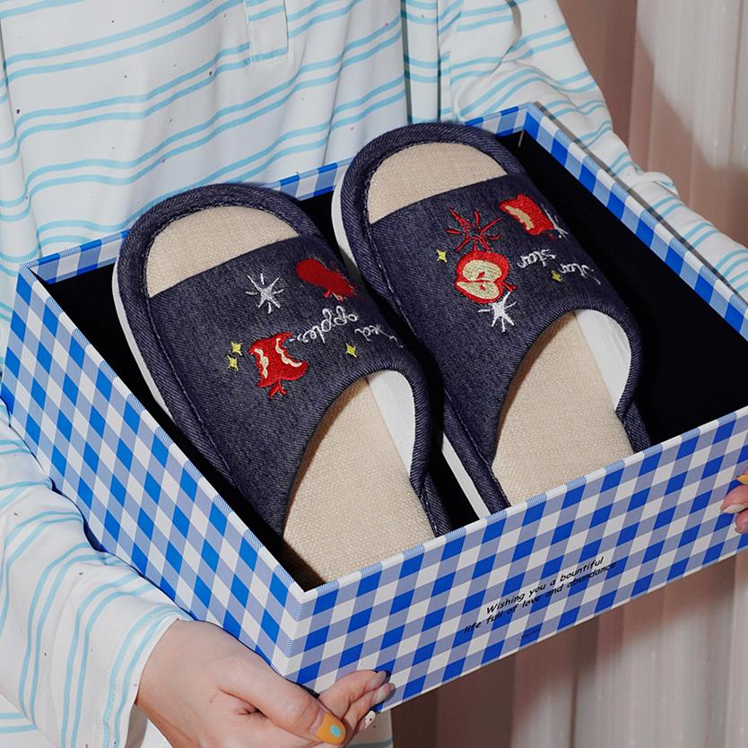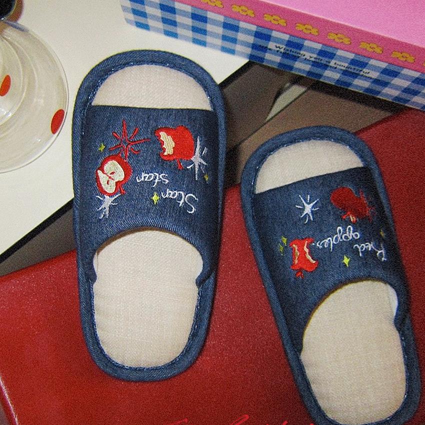 创意英文苹果春夏时尚棉麻拖鞋休闲透气舒适女一字吸汗居家地板鞋