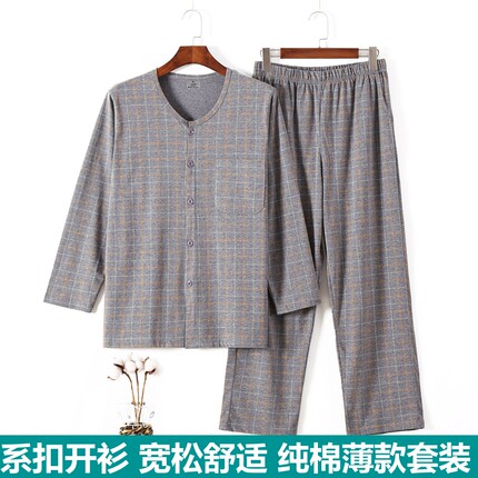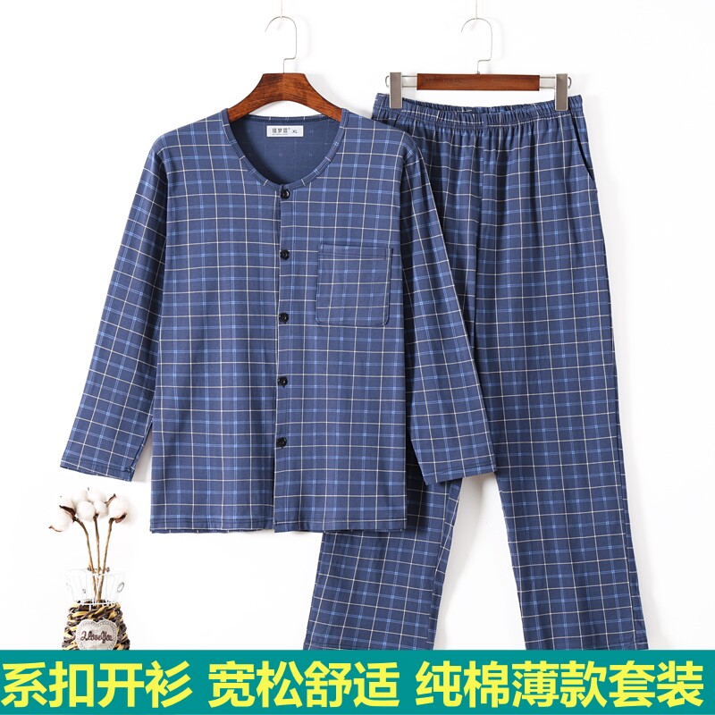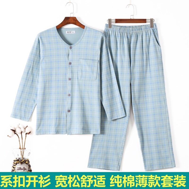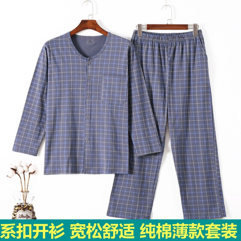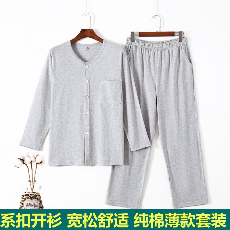 中老年人男士纯棉开衫家居服套装睡衣睡裤宽松大码春夏薄款空调衫