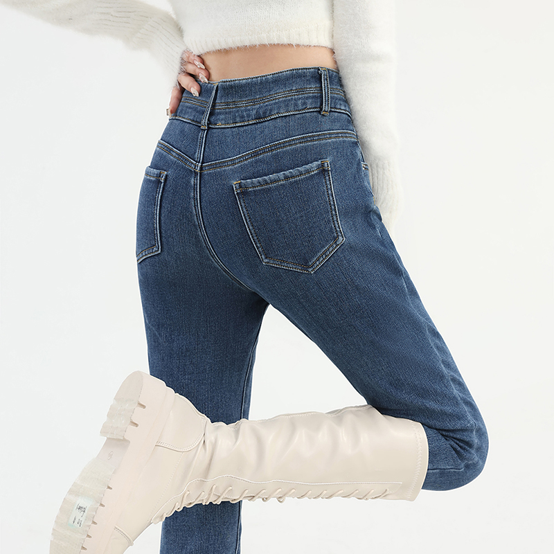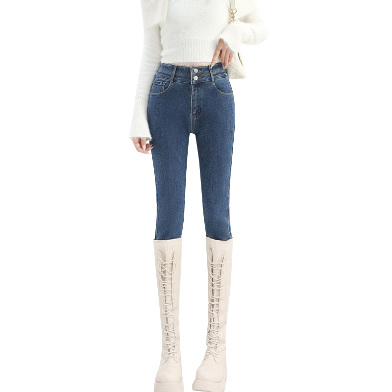 加绒加厚美式复古牛仔裤女秋冬小个子高腰显瘦修身九分小脚铅笔裤