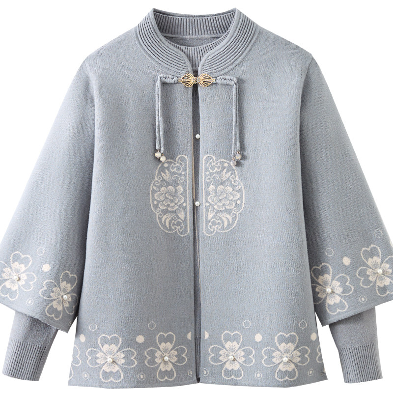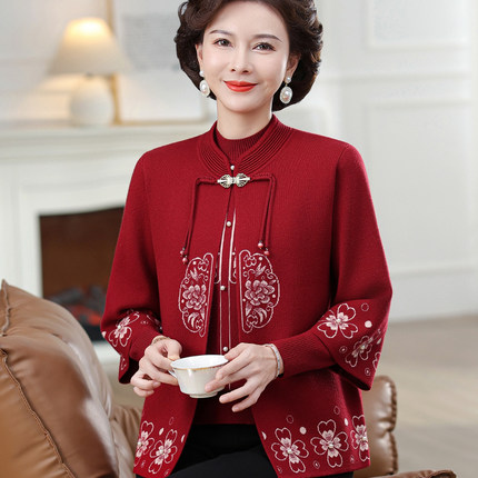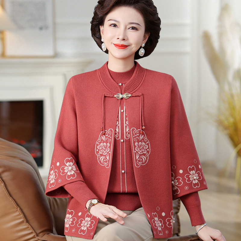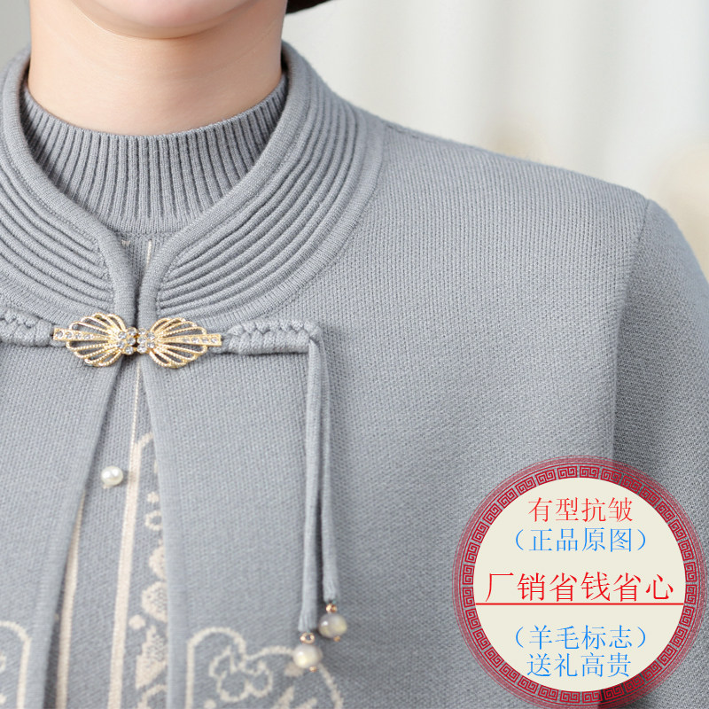 2025新中式妈妈加绒秋冬装针织两件套中老年女冬国风毛衣羊毛外套