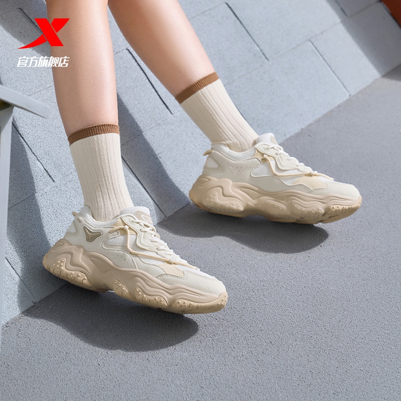 特步火山休闲鞋2025新款女鞋网面透气轻便增高复古老爹鞋运动鞋子