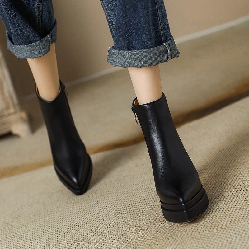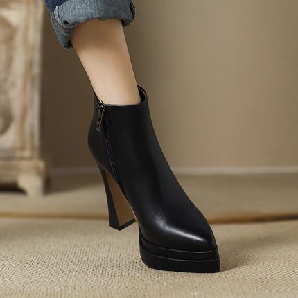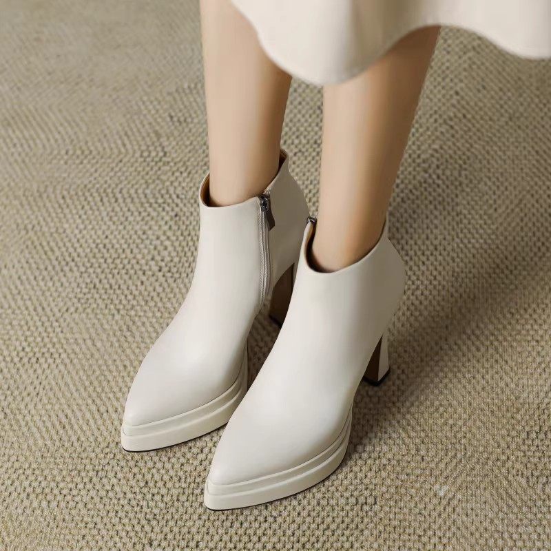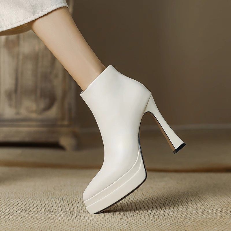 12cm防水台真皮短靴女尖头厚底粗跟米白色及裸单靴超高跟时装靴子