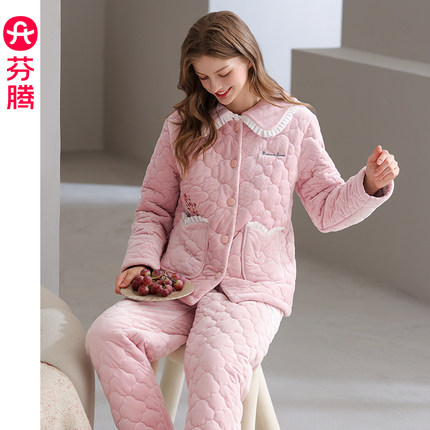 芬腾冬季女珊瑚绒三层夹棉家居服