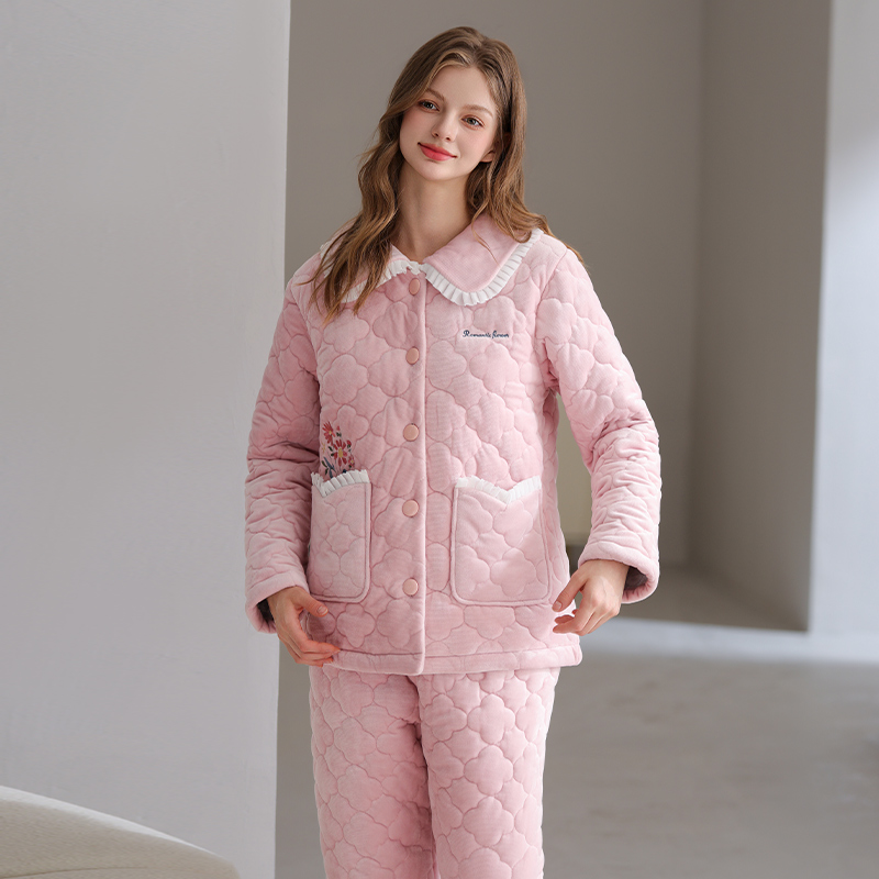 芬腾女睡衣冬季珊瑚绒夹棉袄三层加厚套装法兰绒抗静电保暖家居服
