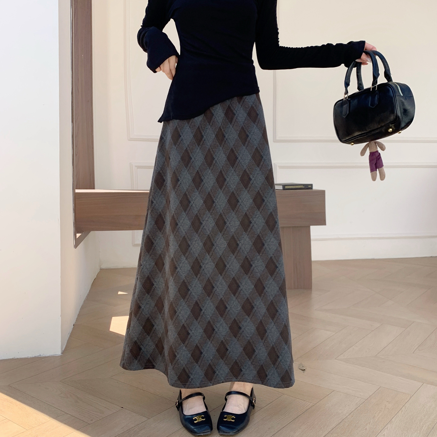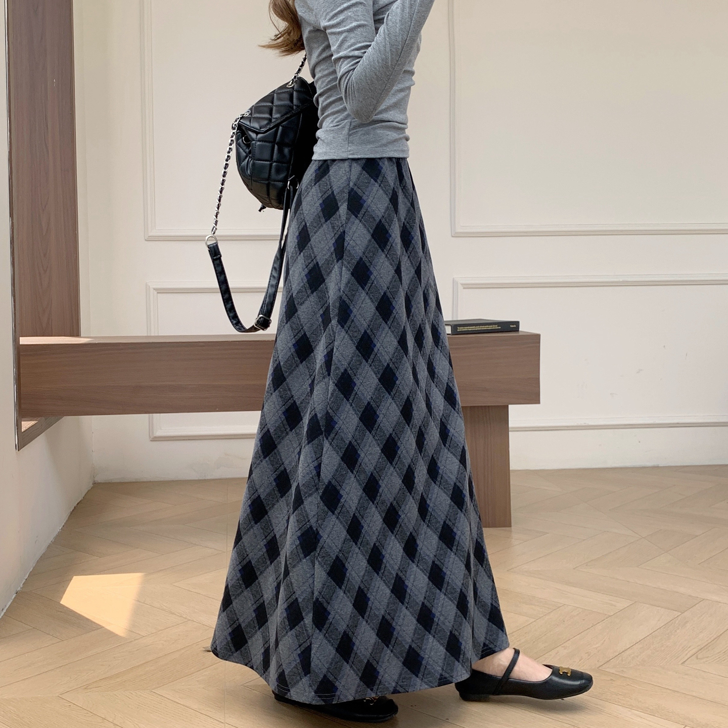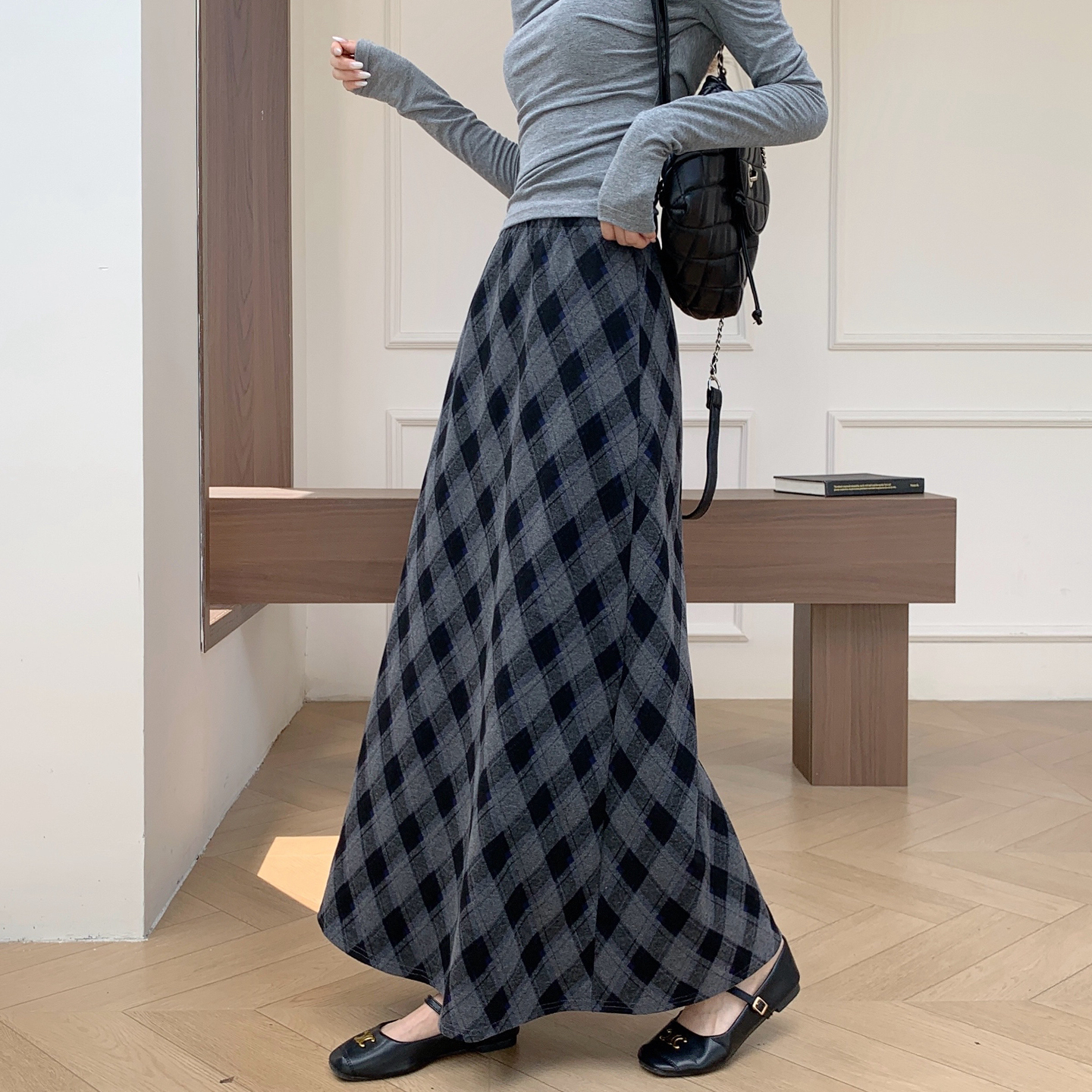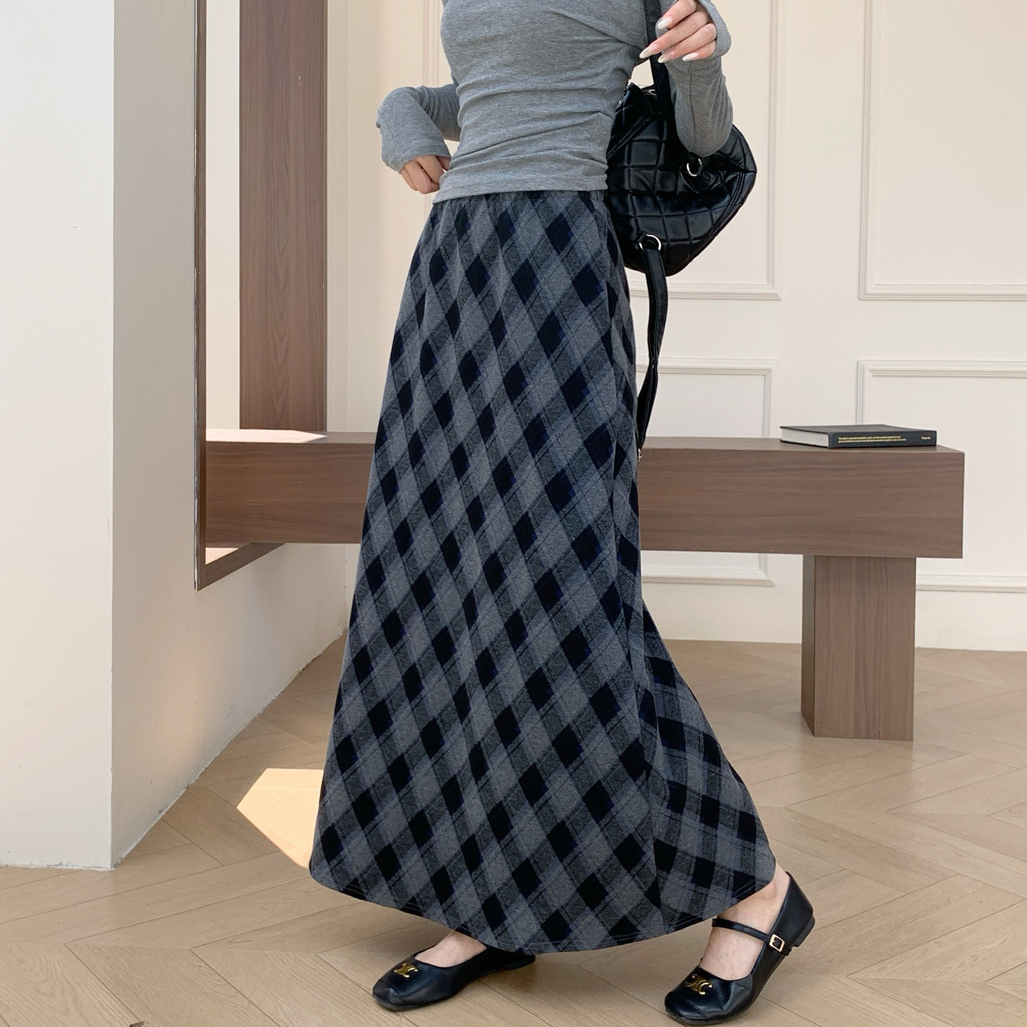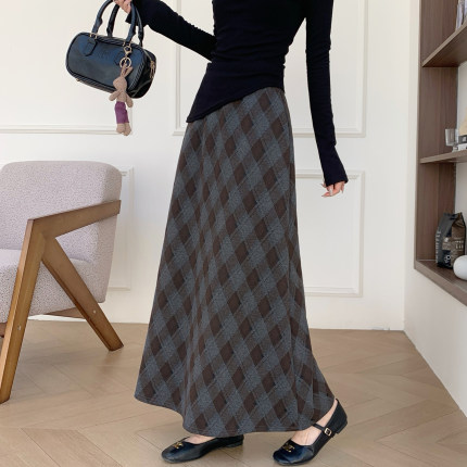 巨好看格子裙女毛呢半身裙秋冬新款斜条纹宽松格纹小A字包臀长裙