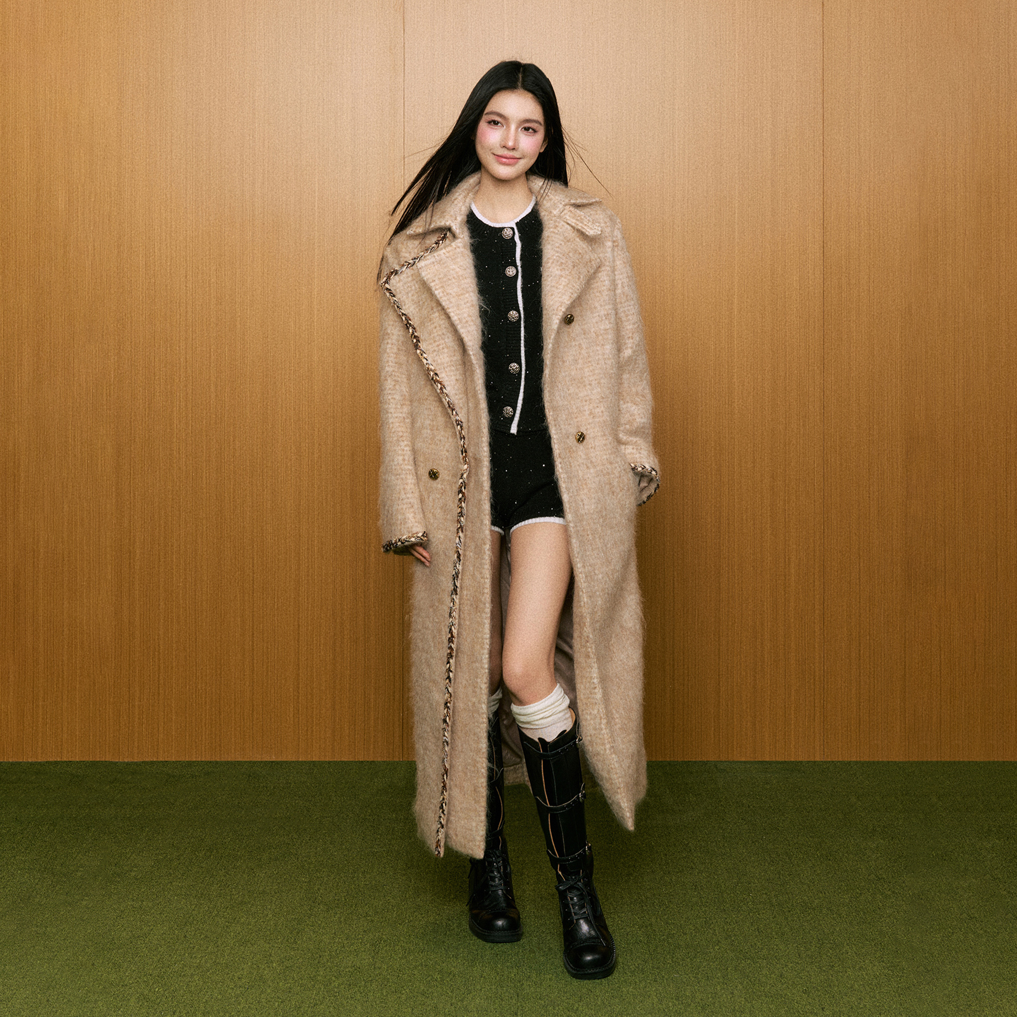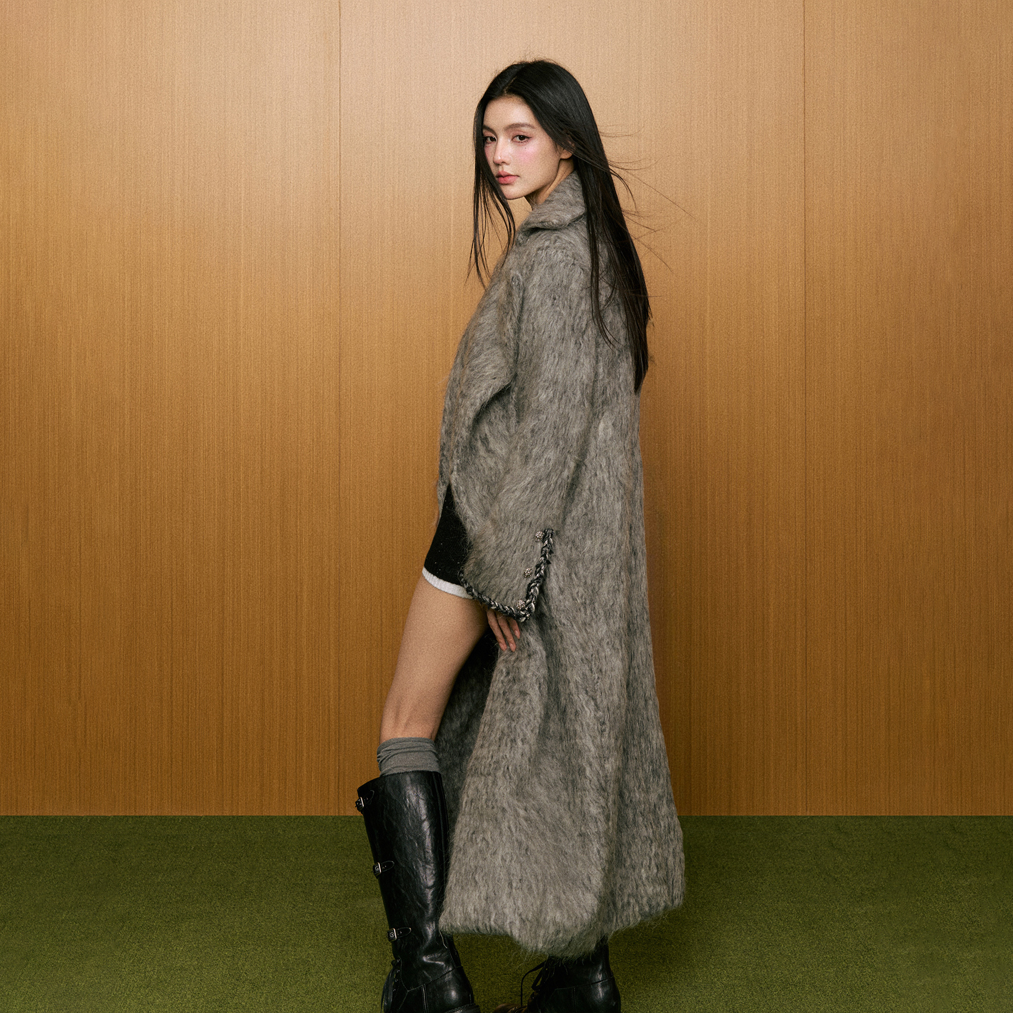AGAM 重工小香风气质毛呢灰色大衣女长款编织翻领厚羊毛呢子外套