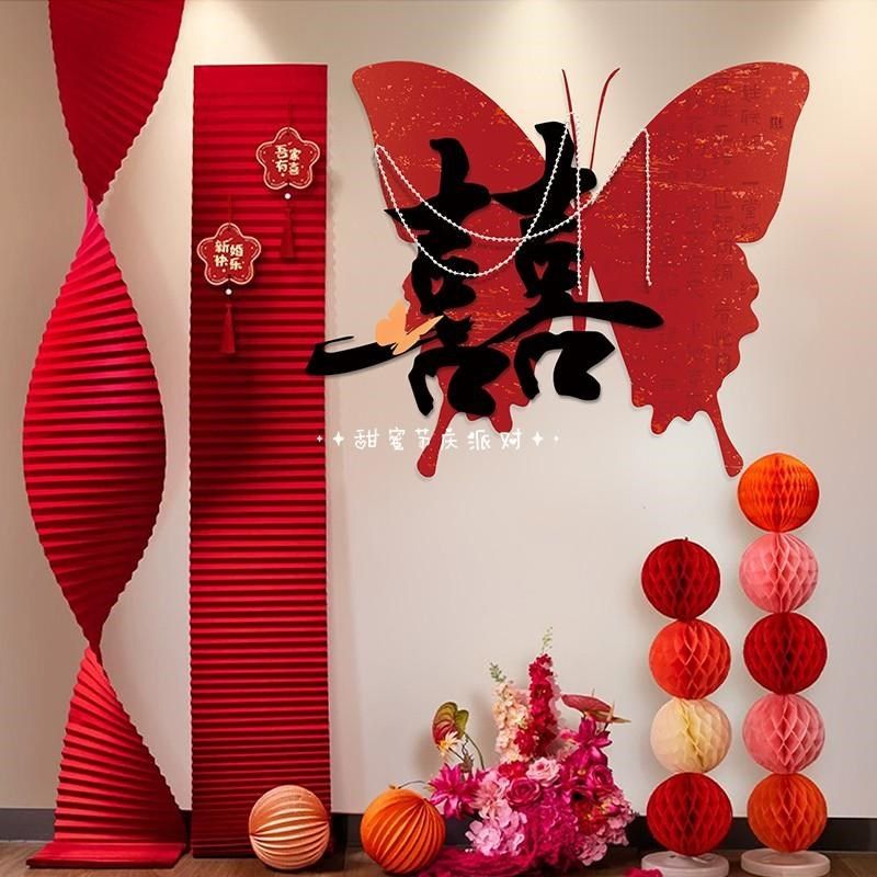 蝴蝶kt板结婚婚房布置女方卧室婚礼新房客厅装饰晨袍拍照背景墙
