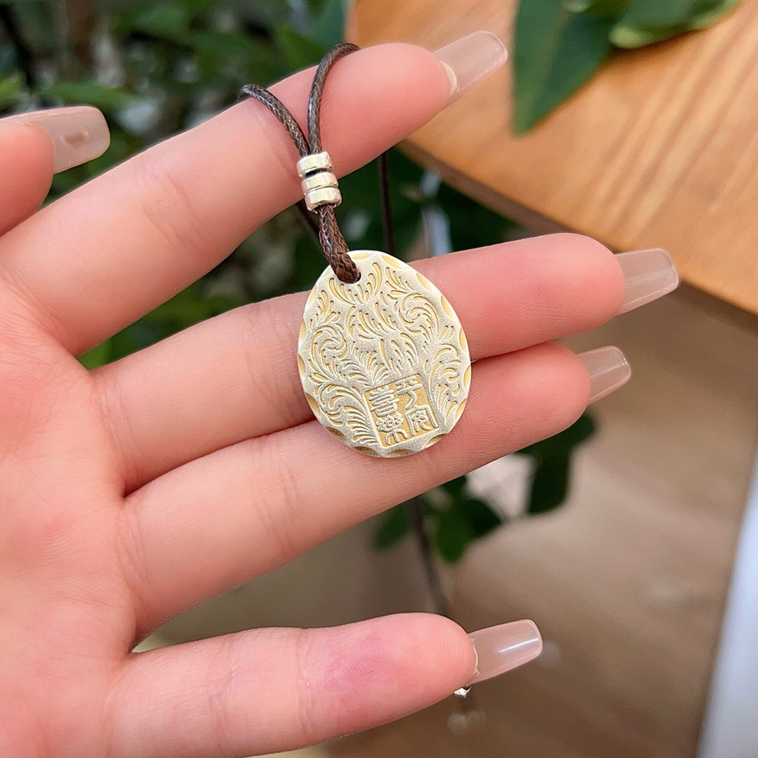 足银999描金唐草纹吊坠平安喜乐纯银项链新中式国风无事牌银饰