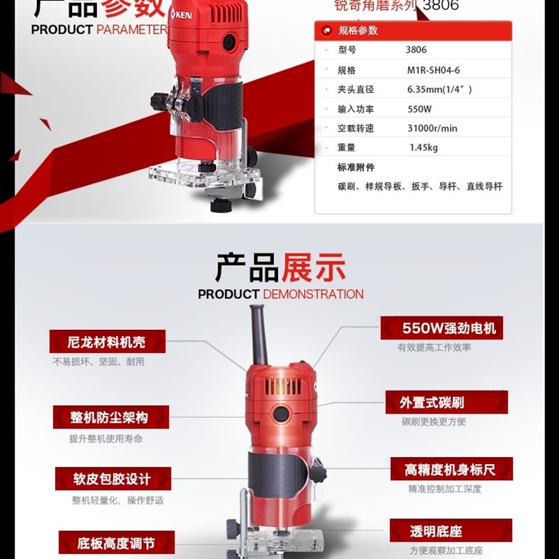 KEN锐奇修边机大功率木工雕刻机z铝塑板开槽机小锣机开孔倒角3806