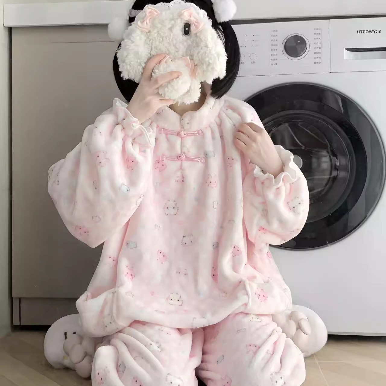 原创!冬季新款卡通法兰绒可爱加绒加厚可外穿睡衣女新中式家居服