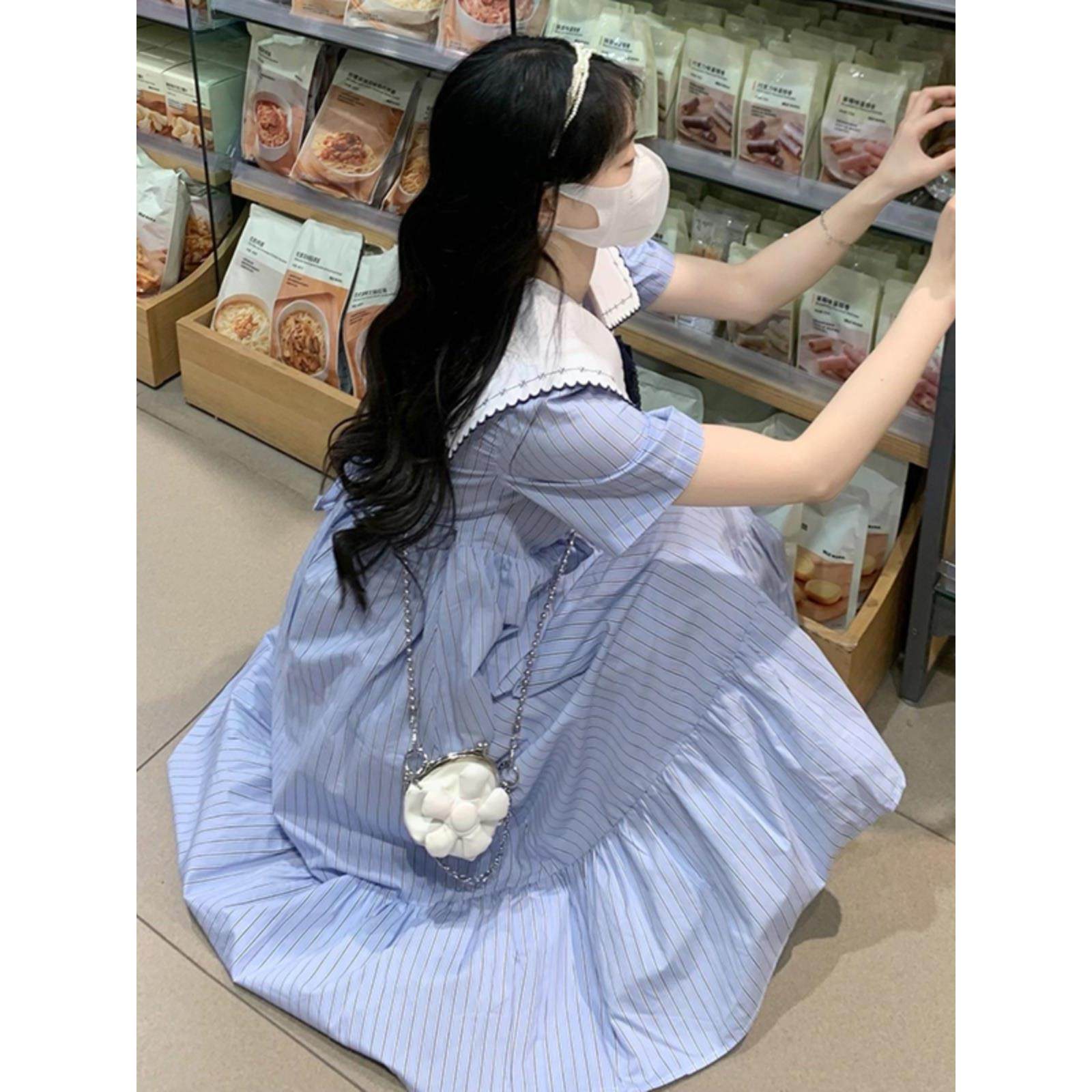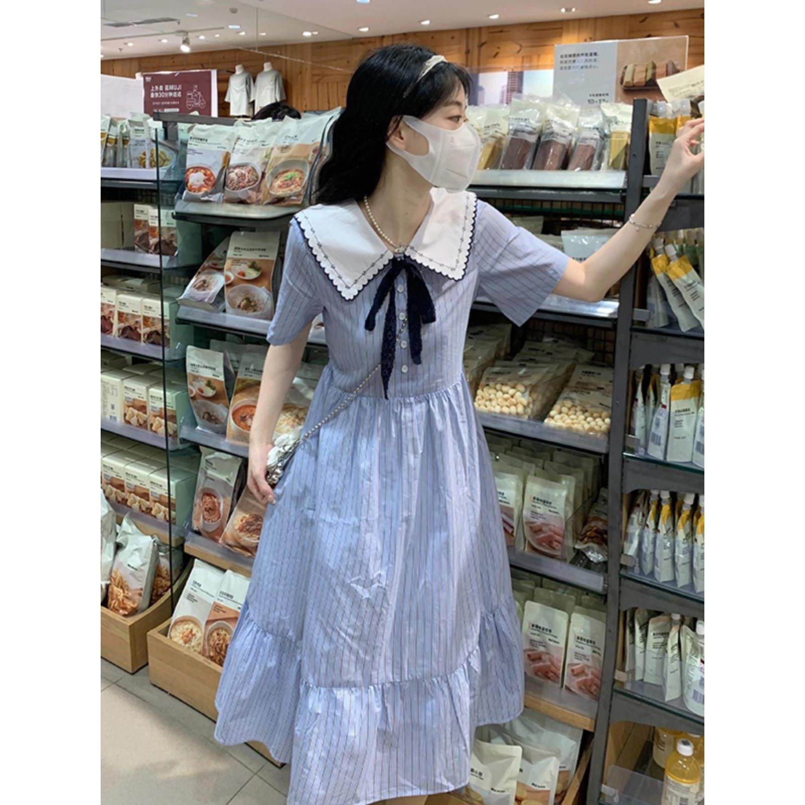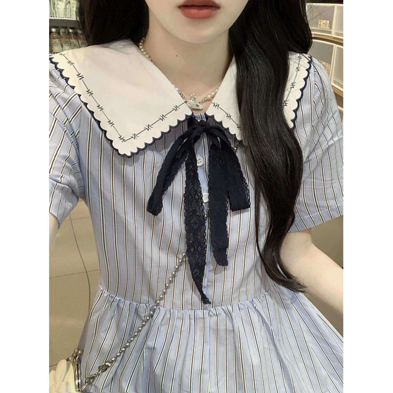 初中生甜美学院风中长裙夏2025新款高中学生时尚少女娃娃领连衣裙