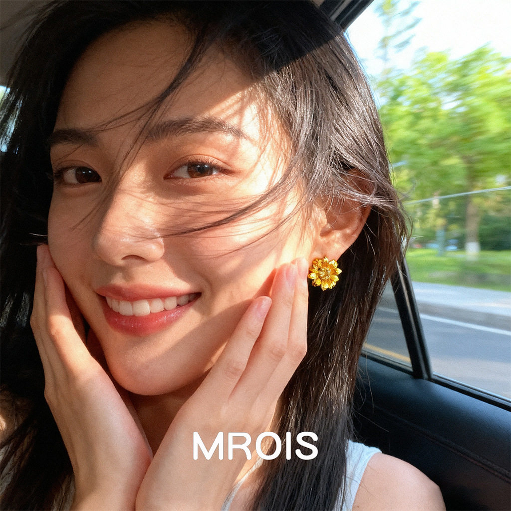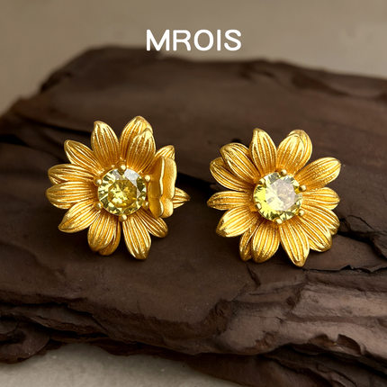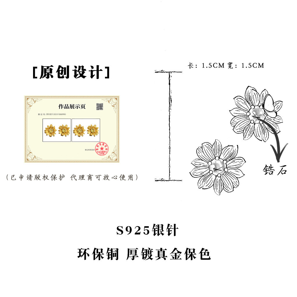 原创向日葵花朵镶锆石耳环镀18K真金保色925银针耳钉轻奢耳夹饰品