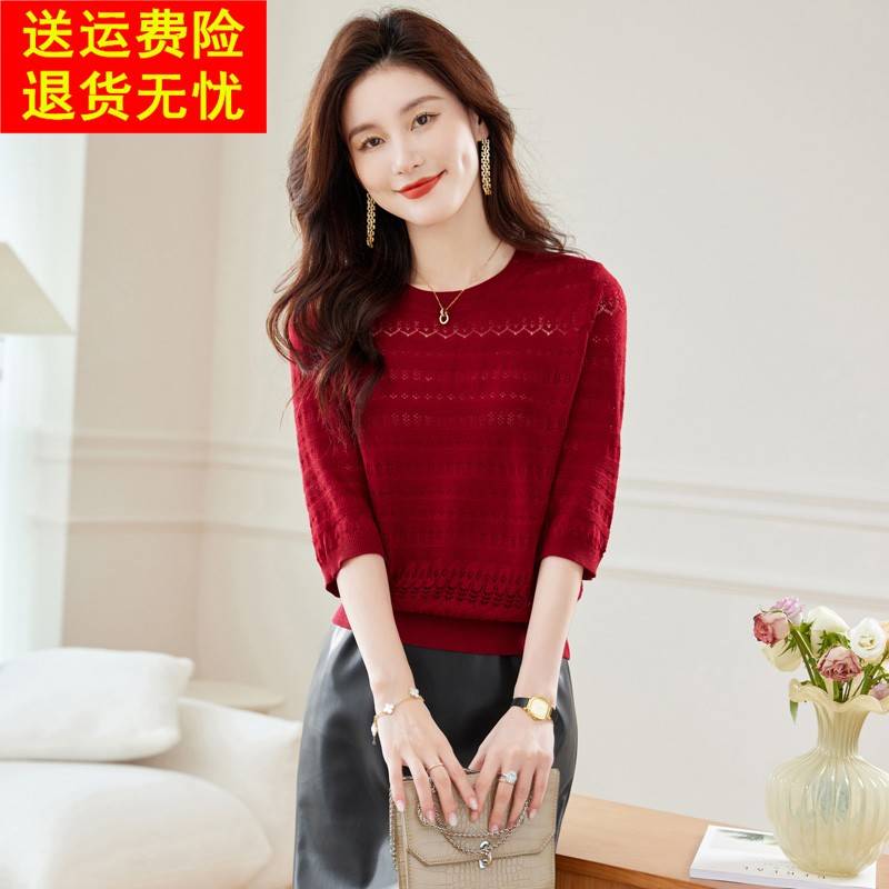 早春针织衫女上衣2025夏季镂空七分袖t恤薄款今年流行中袖打底衫