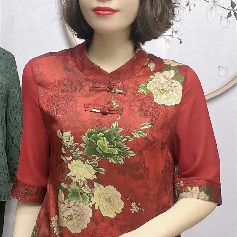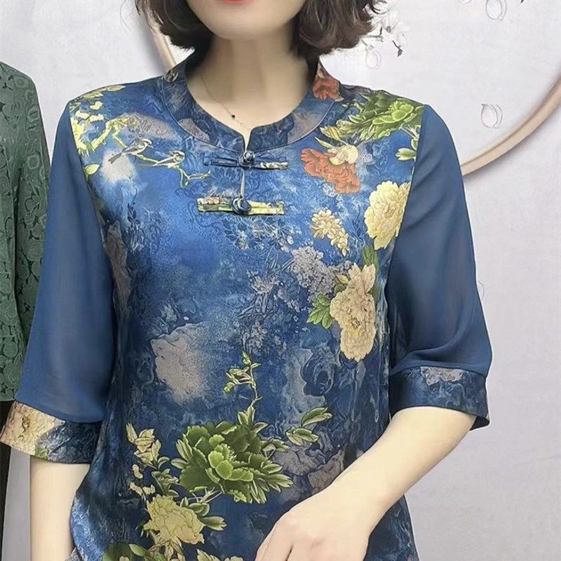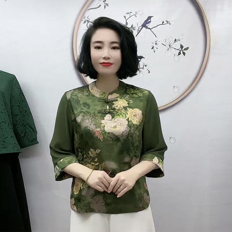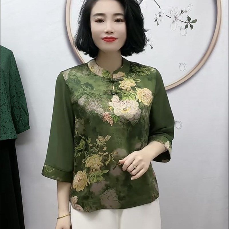 中年妈妈真丝衬衣女七分袖衬衫夏装新款盘扣小衫中袖大码旗袍上衣