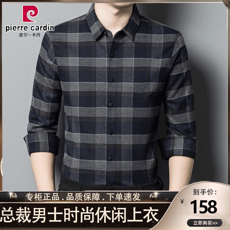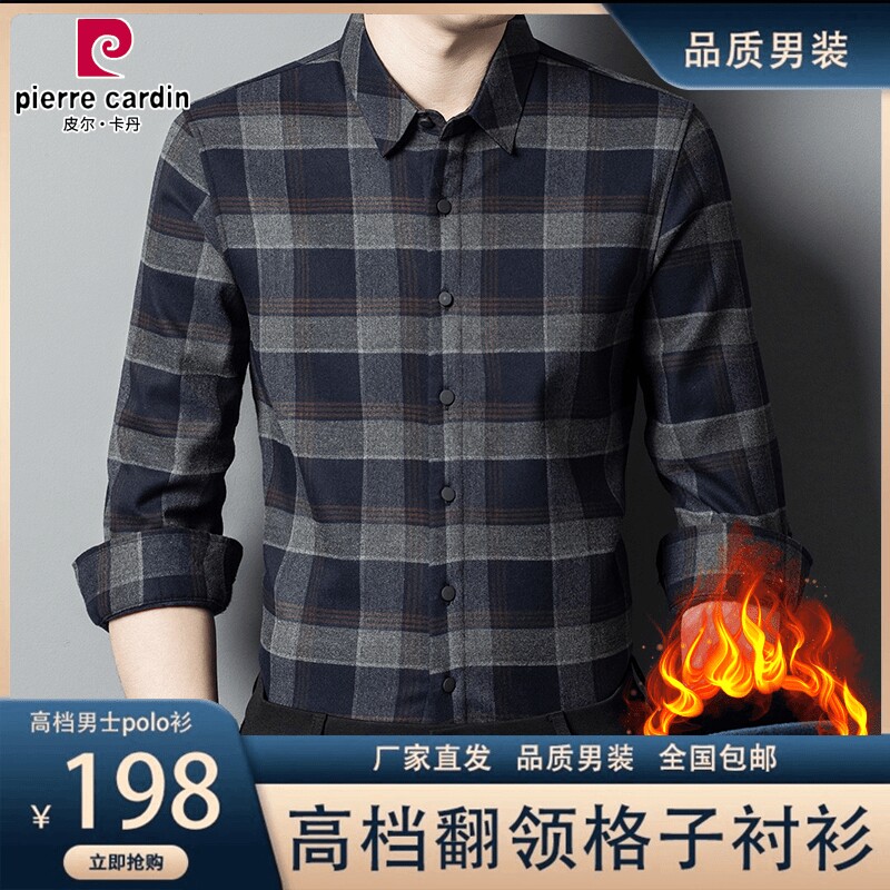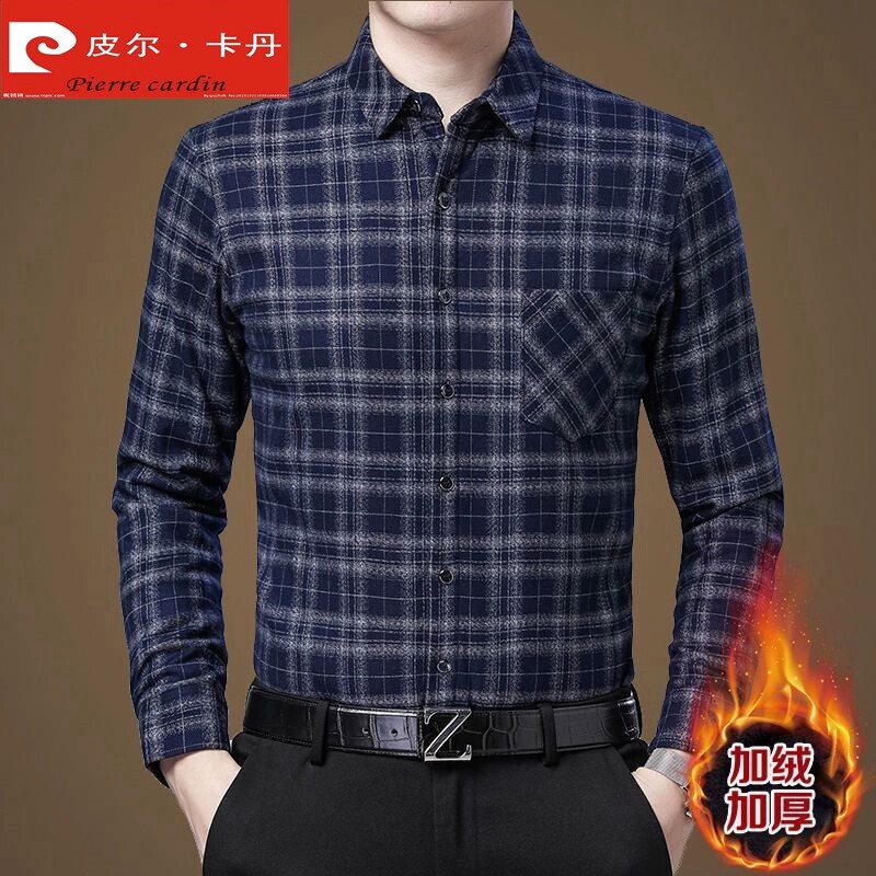 皮尔卡丹衬衫男士长袖2024春秋季中年磨毛寸衫爸爸装加绒格子衬衣