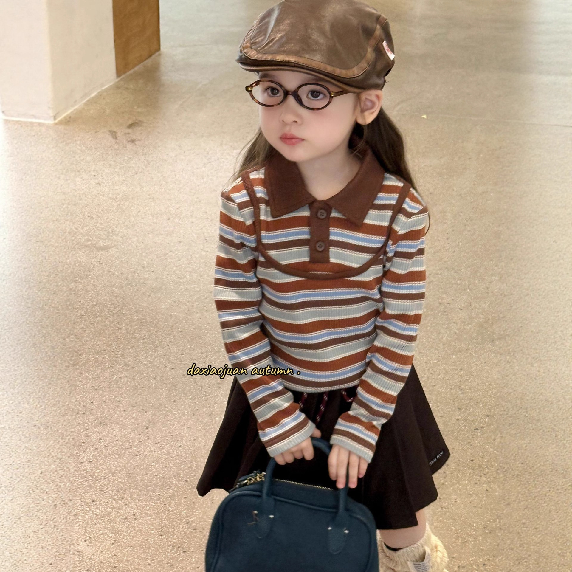 女童撞色纯棉韩版条纹T恤长袖2025新款儿童打底衫纯棉假两件上衣
