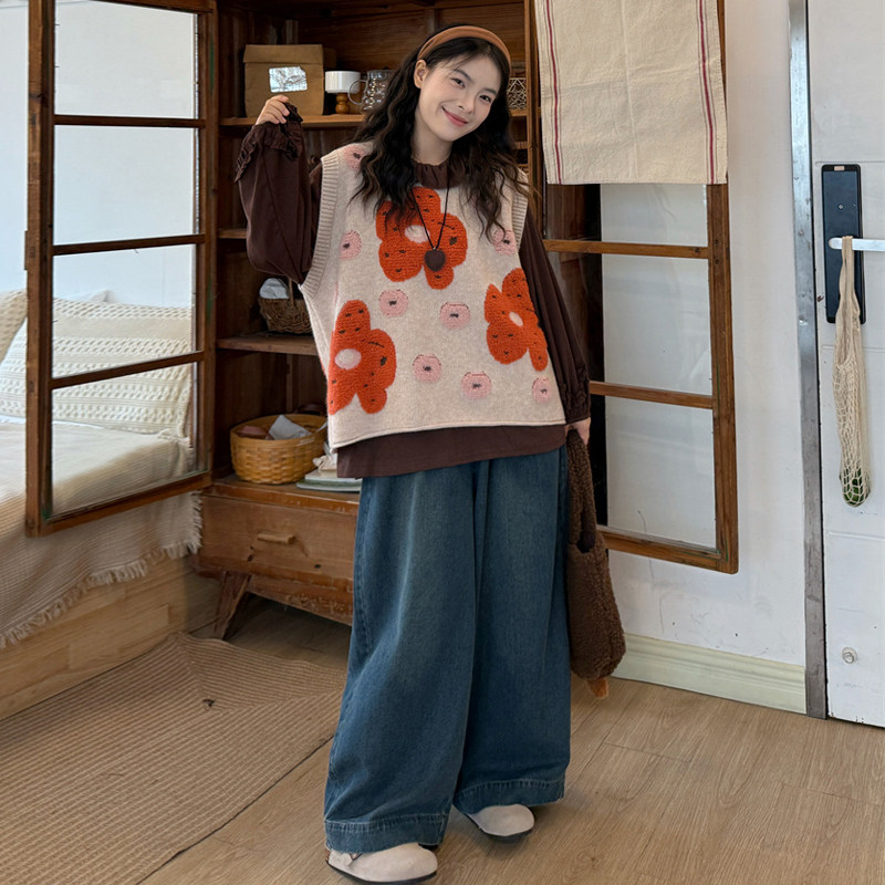 大码女装胖mm宽松显瘦刺绣花朵毛衣马甲百搭叠穿上衣牛仔裤套装冬