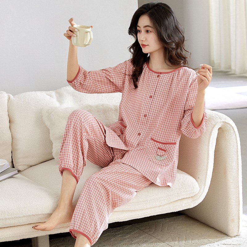 睡衣女夏季纯棉短袖七分袖新款大码九分裤夏天薄款格子家居服套装