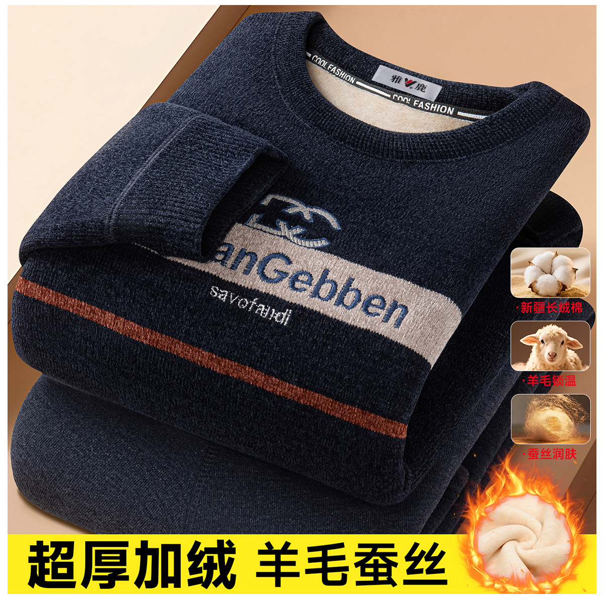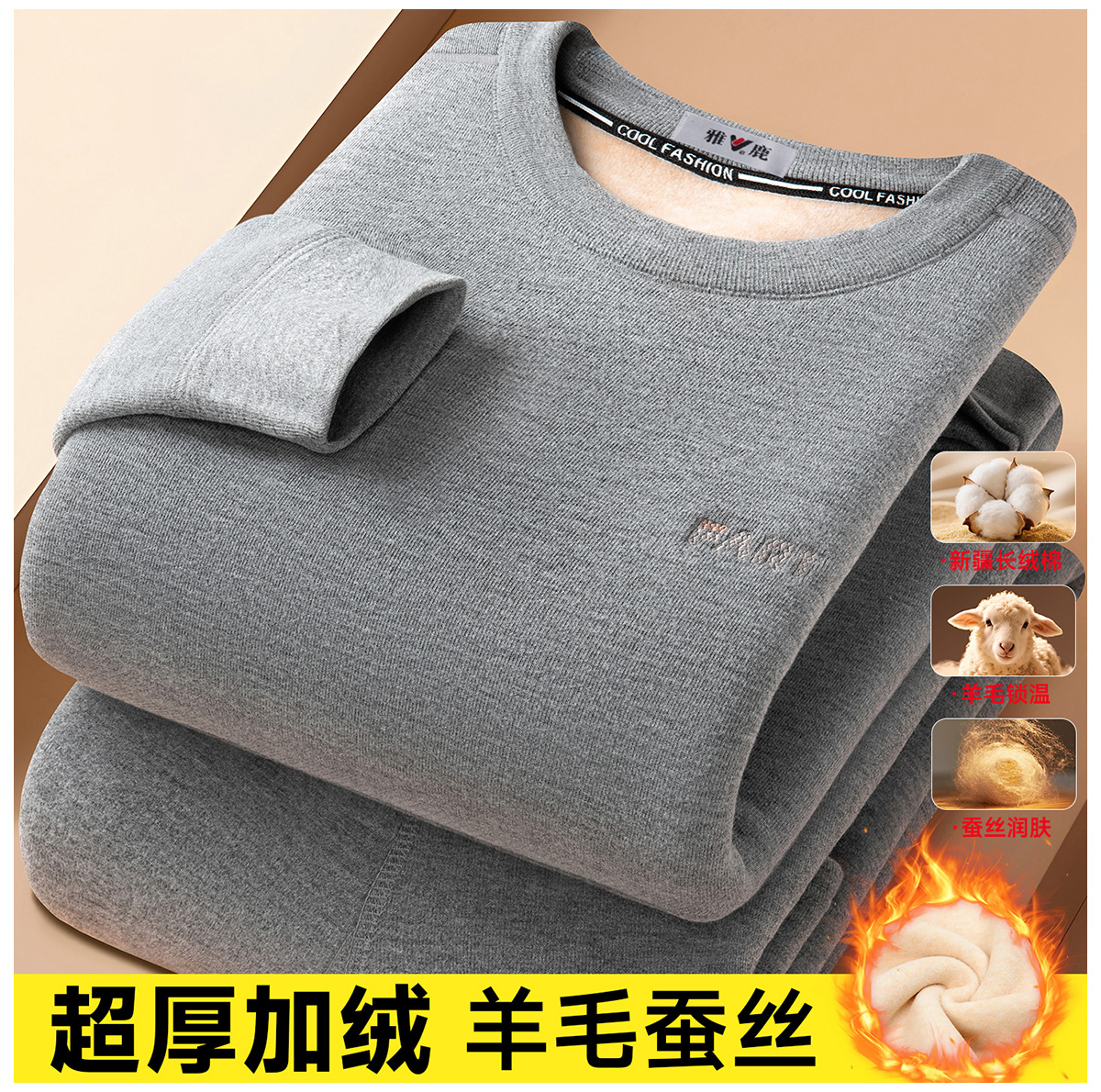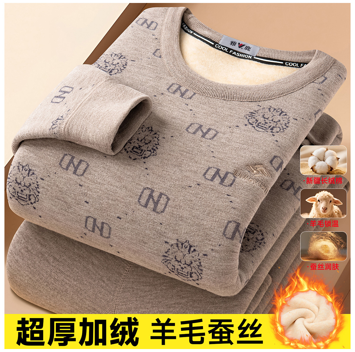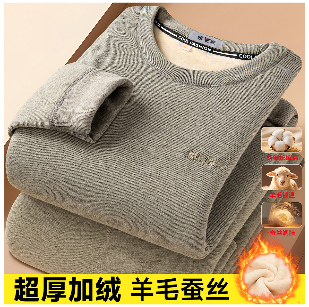 雅鹿巨厚棉羊毛保暖蚕丝内衣加绒加厚秋衣秋裤冬季防寒打底男套装