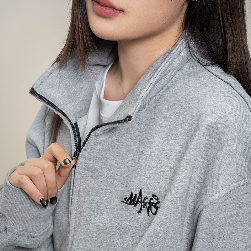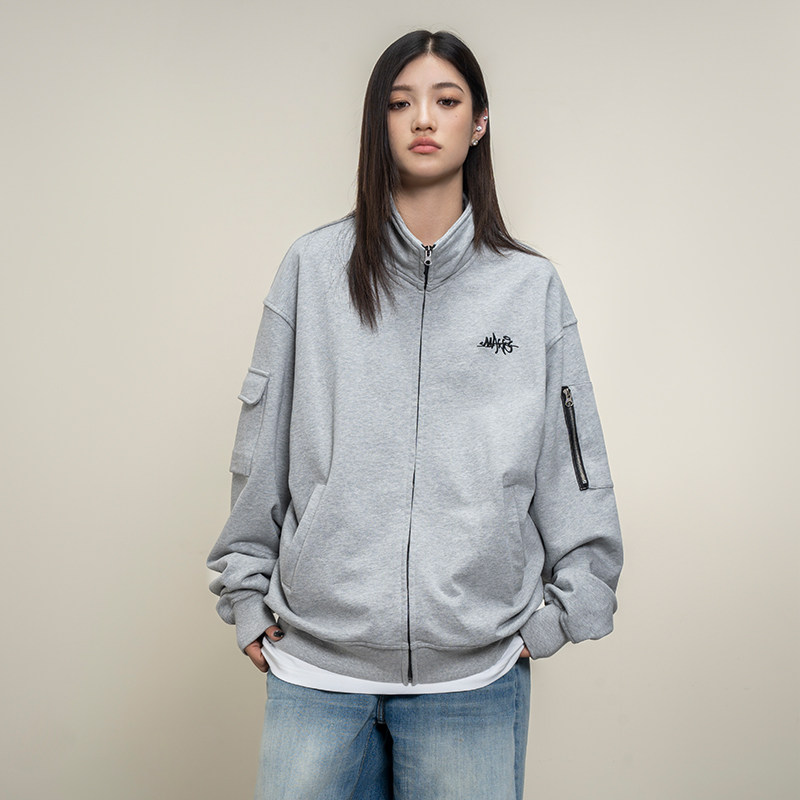 Makemore拉链卫衣开衫男新款秋季美式立领纯棉美式情侣工装外套女