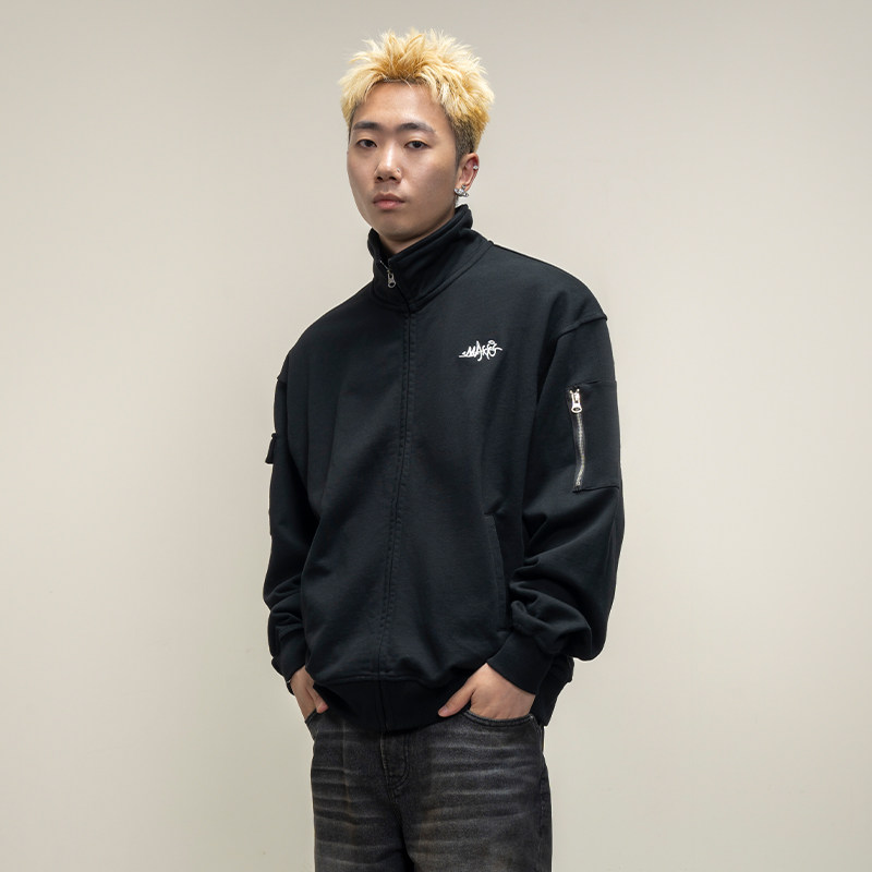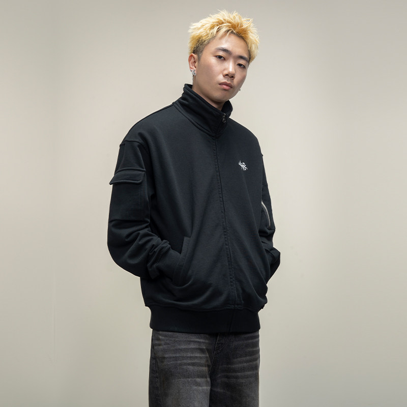 Makemore无帽立领黑色卫衣外套男