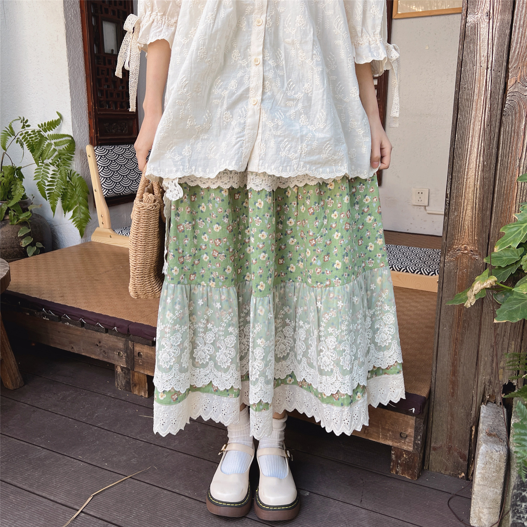 森系复古绿色碎花棉麻半身裙松紧腰少女荷叶蕾丝绑带显瘦减龄长裙