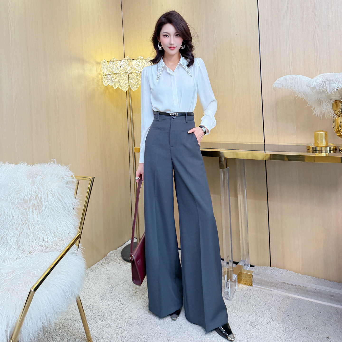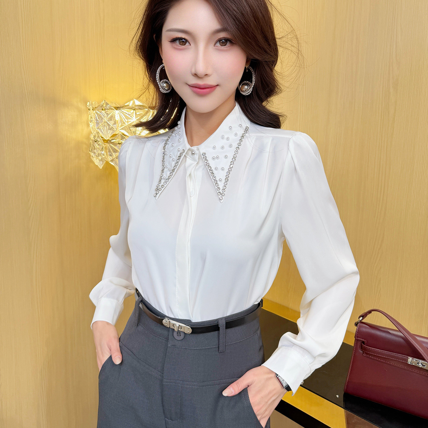 飞姐定制2026春韩版通勤重工钉珠立领气质衬衫宽松长袖雪纺衫上衣