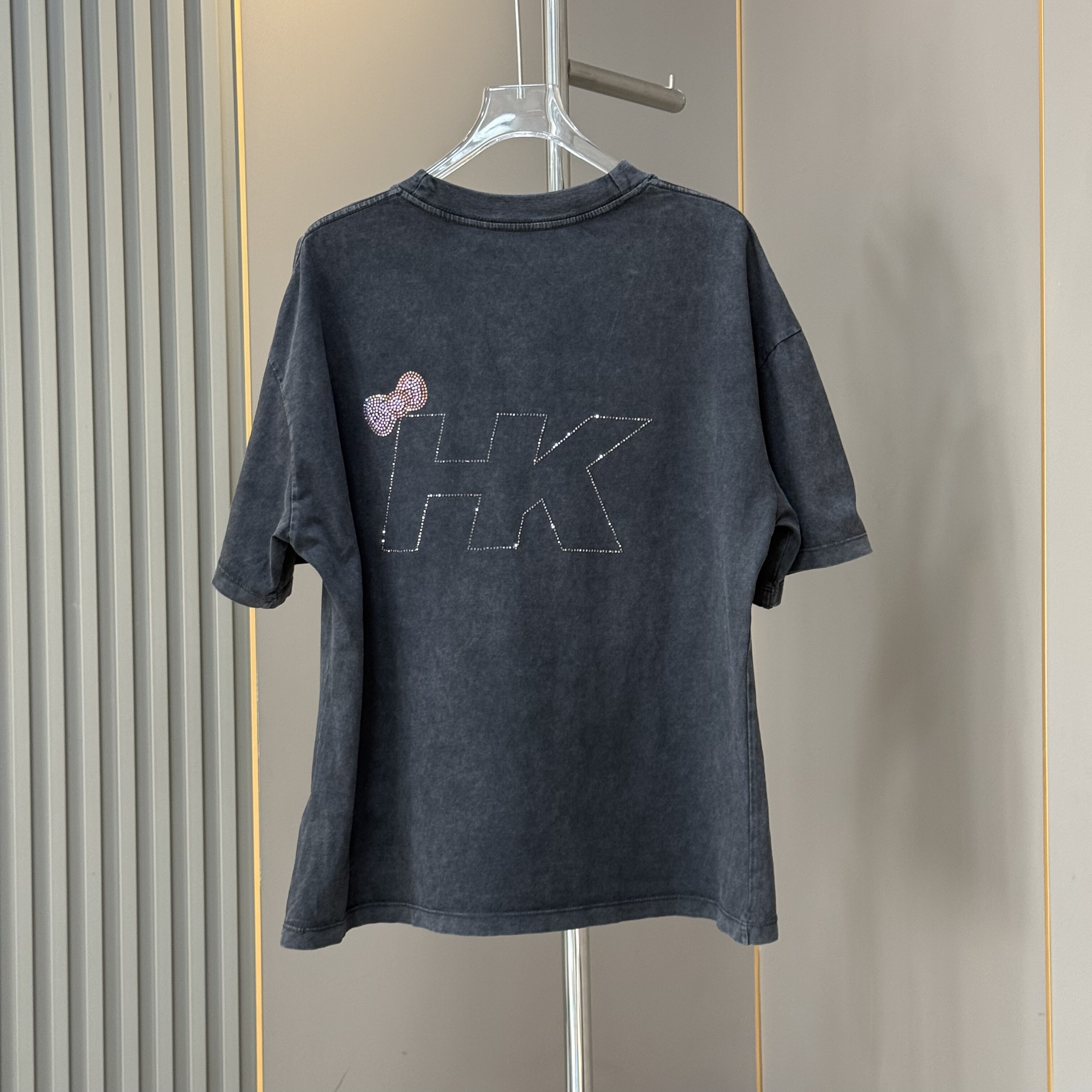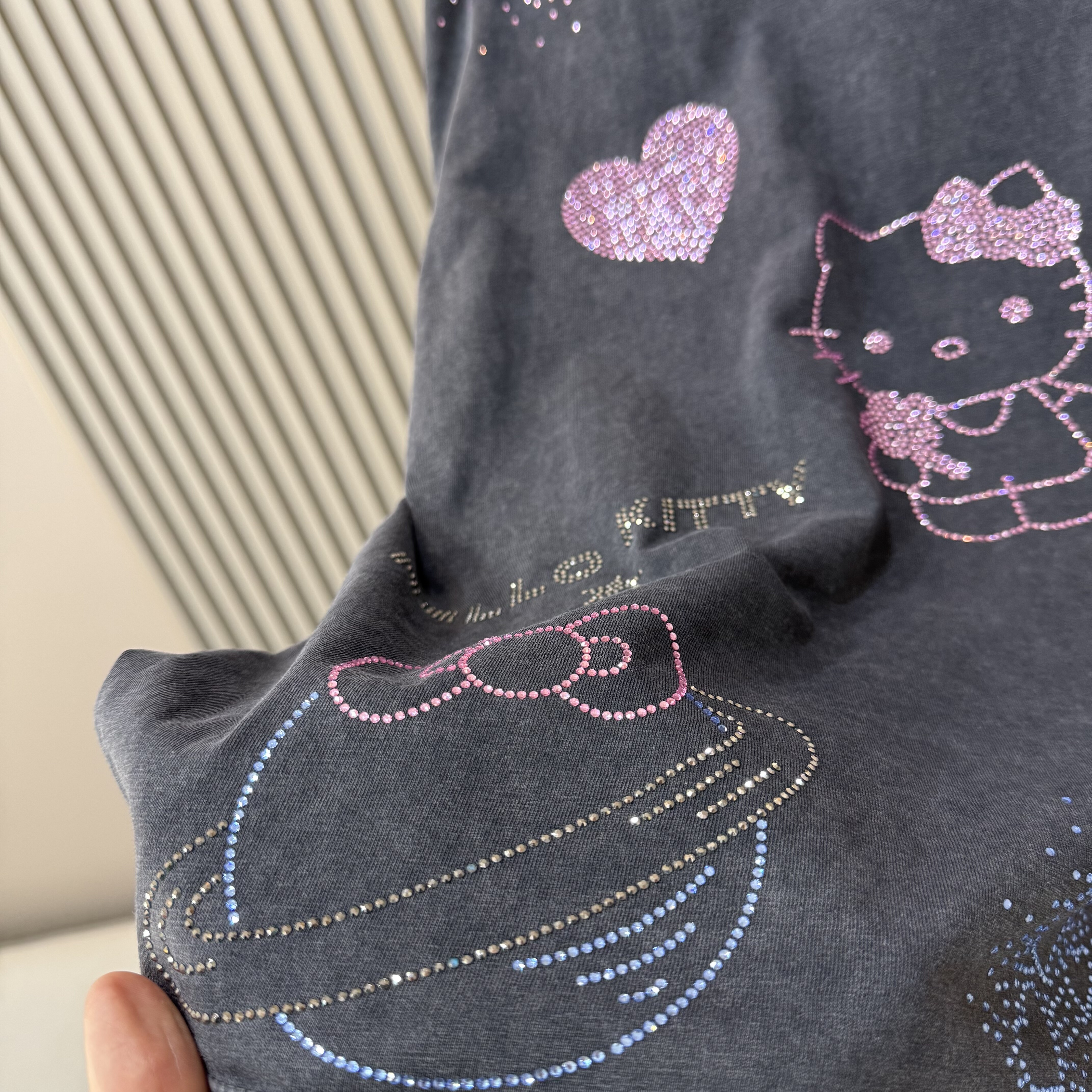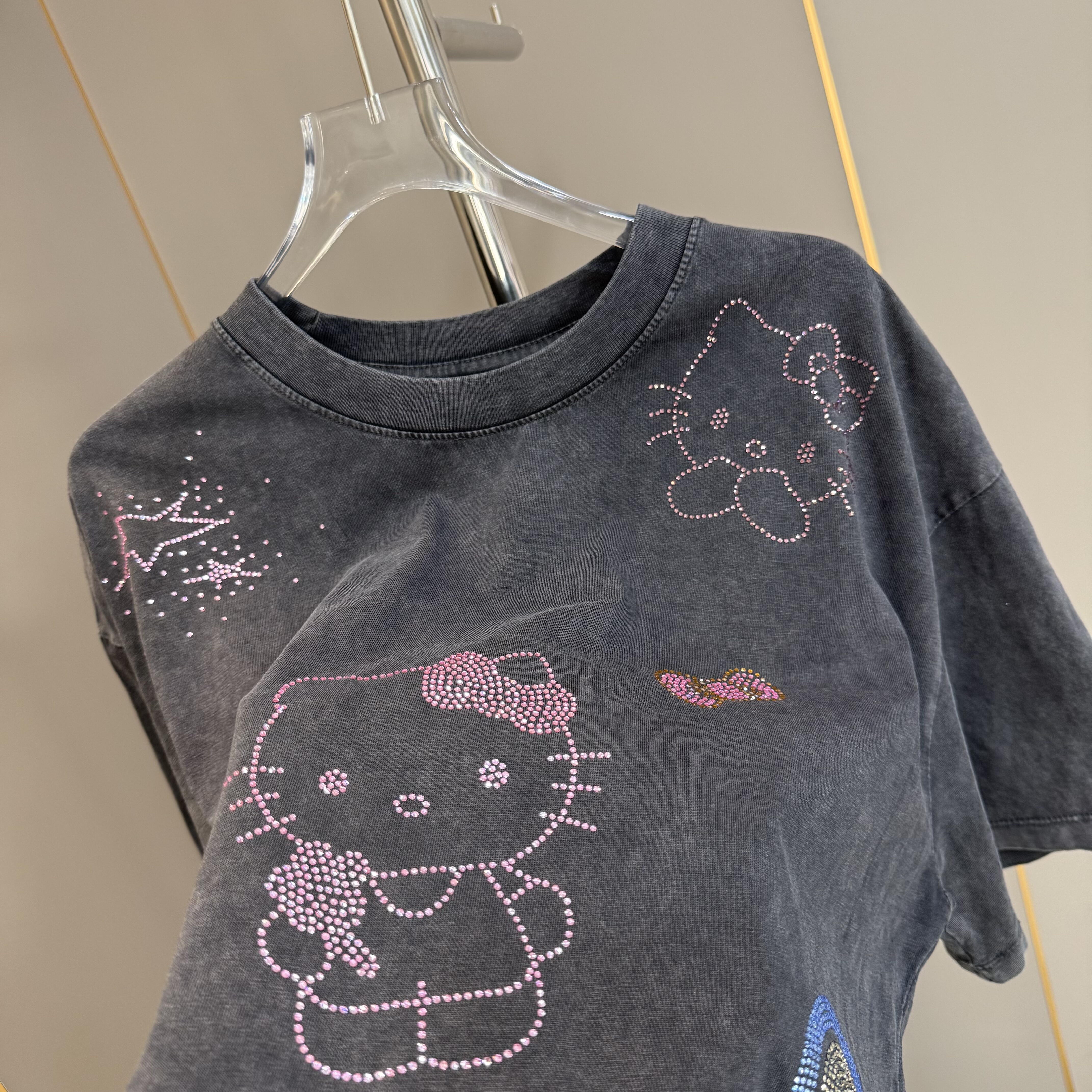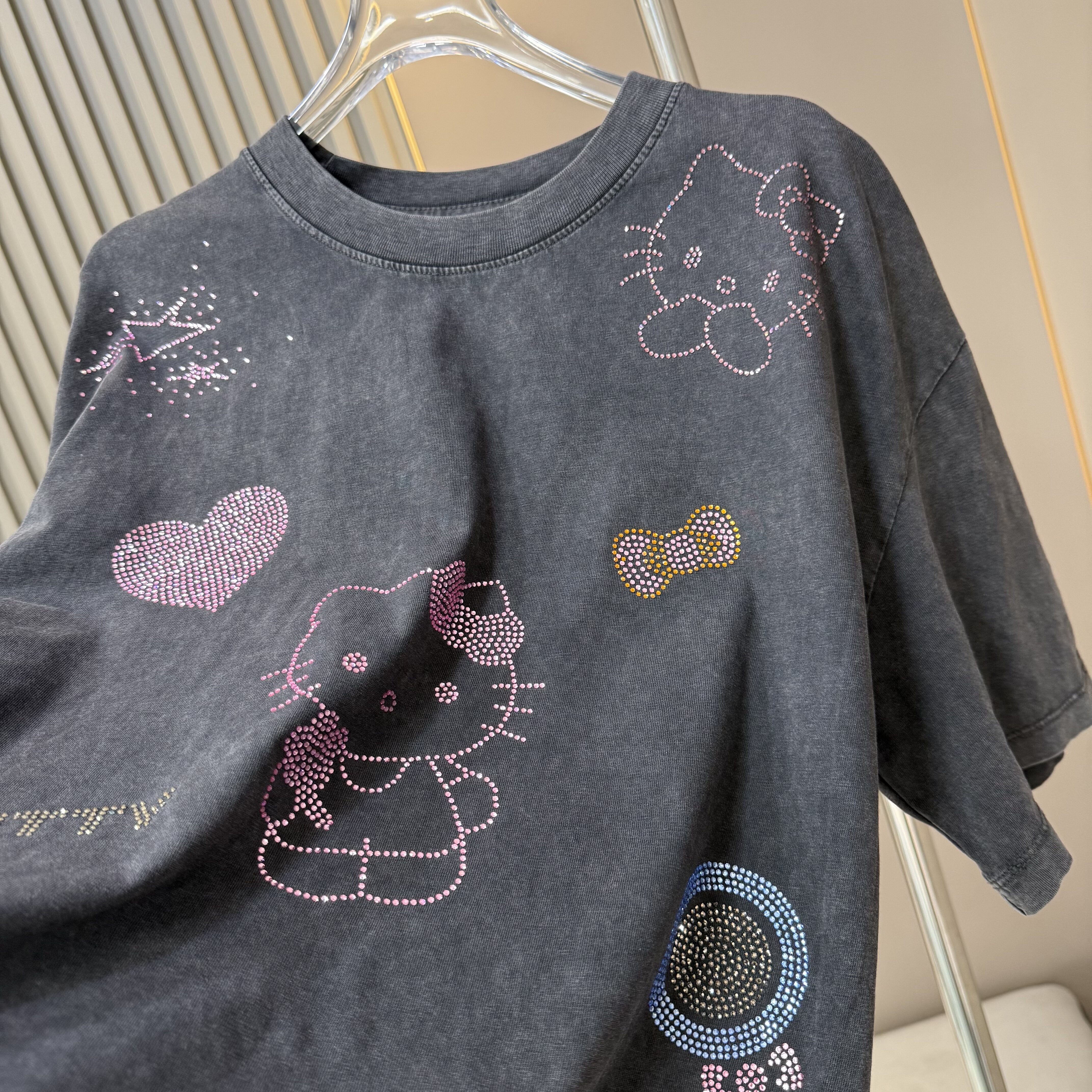 欧货2026早春新款时尚减龄烫钻Kitty猫咪做旧短袖T恤女宽松上衣