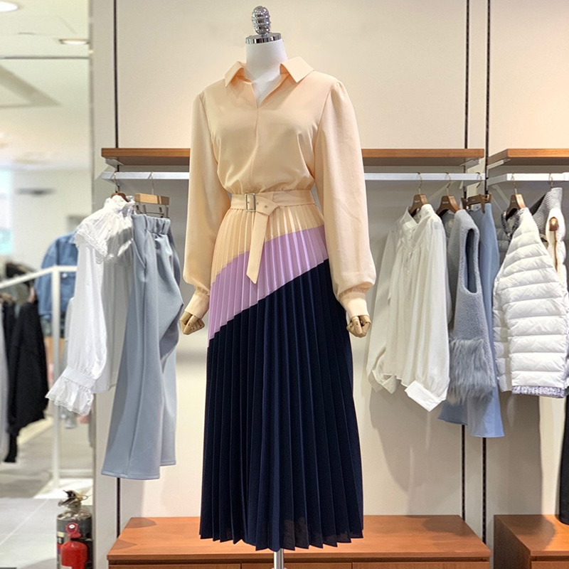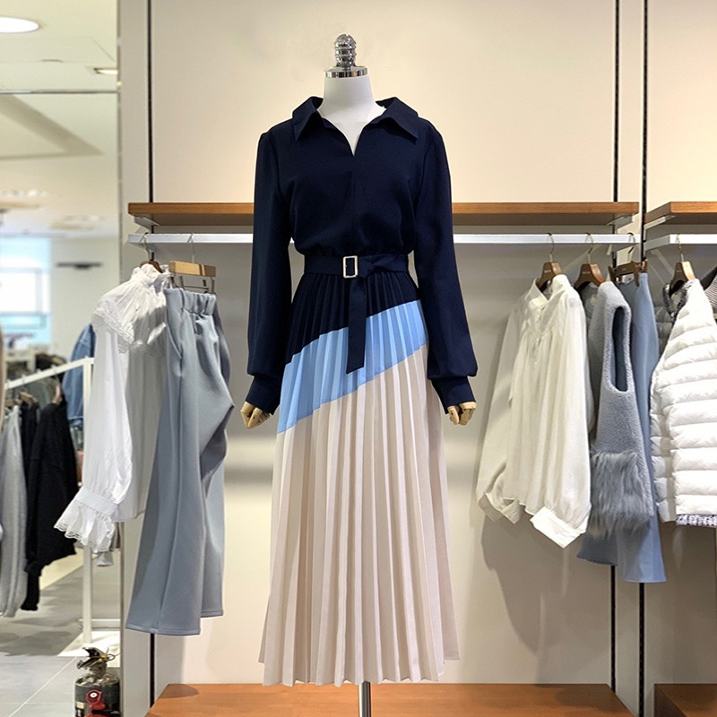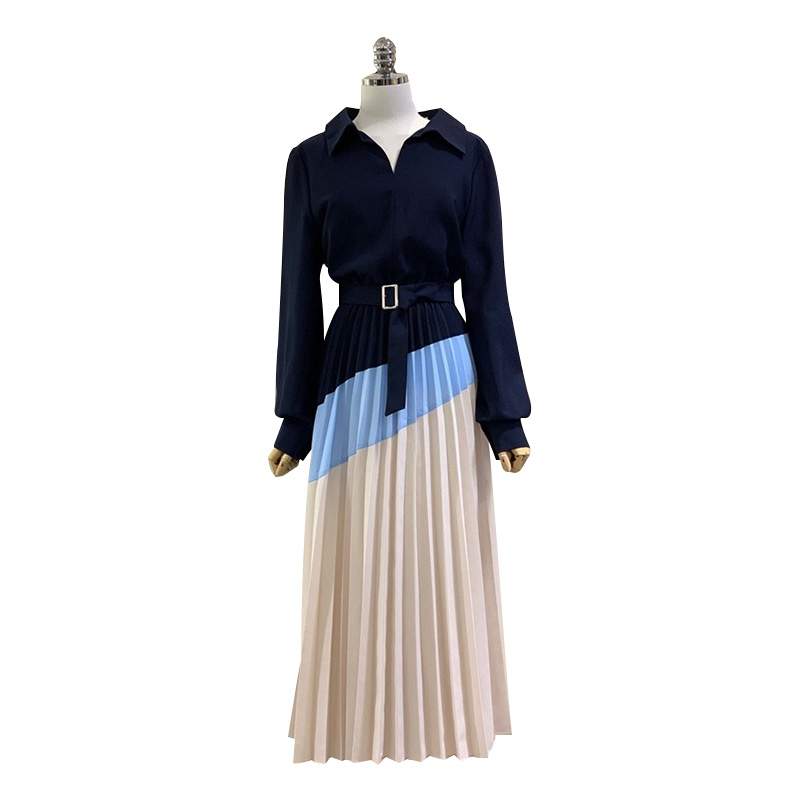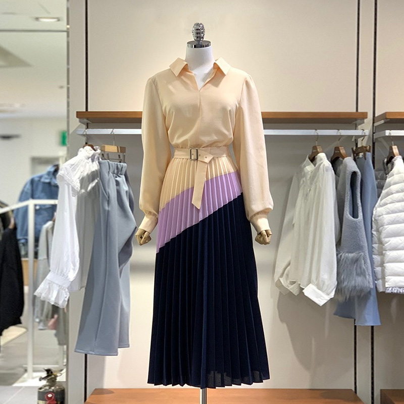 时尚收腰百褶连衣裙2024秋季衬衫领系带气质减龄洋气拼接长裙女