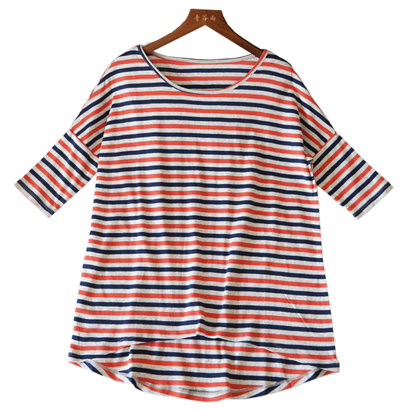 女士百搭宽松显瘦五分袖中长款圆领T恤前短后长条纹衫夏季7394