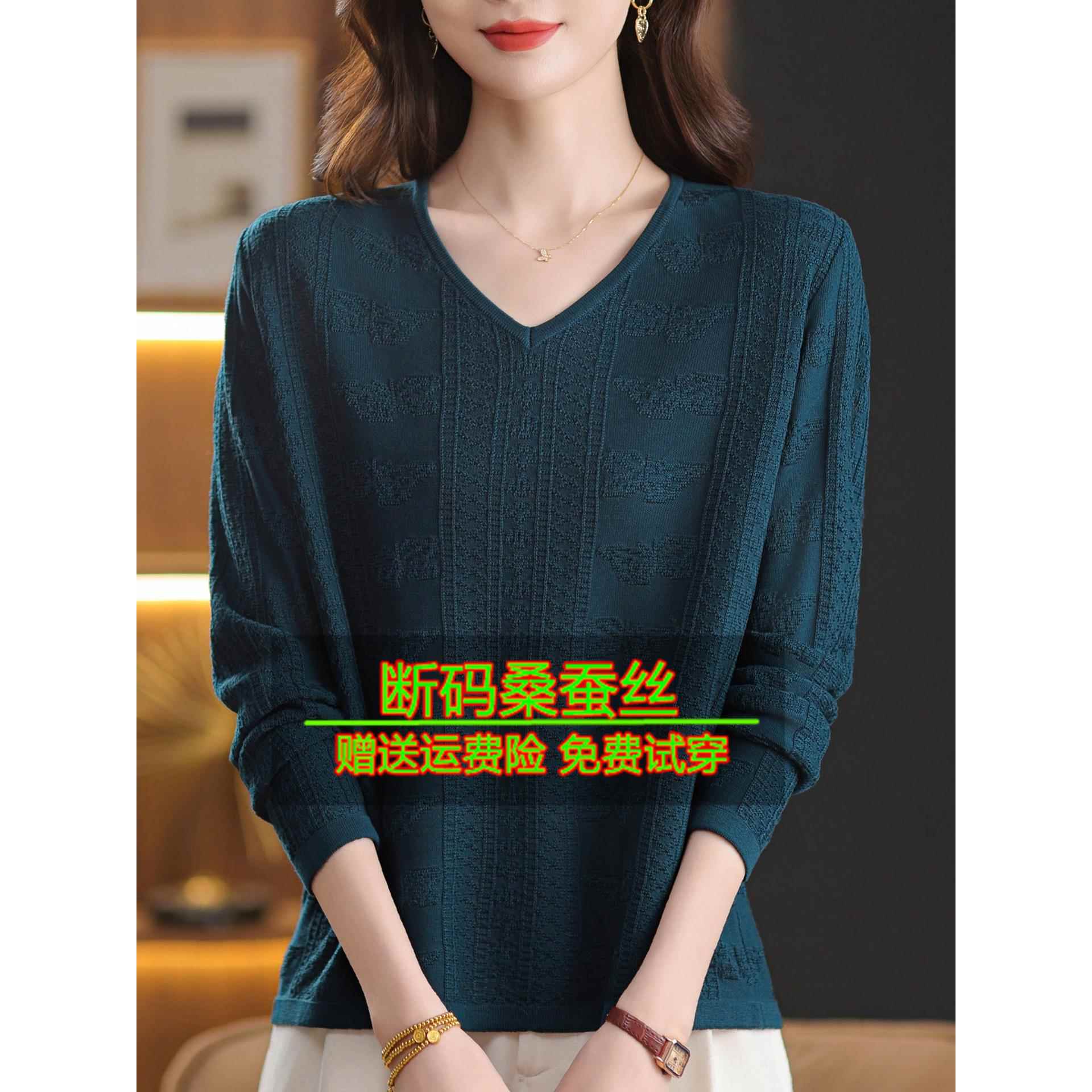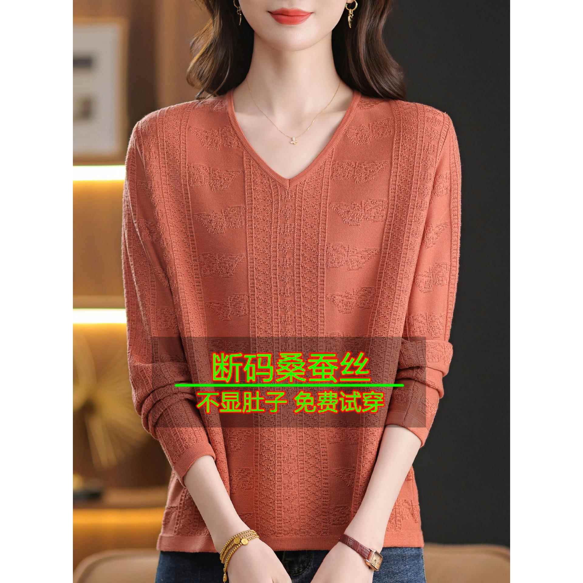 桑蚕丝t恤女2025秋季长袖V领针织宽松上衣妈妈洋气减龄打底小衫