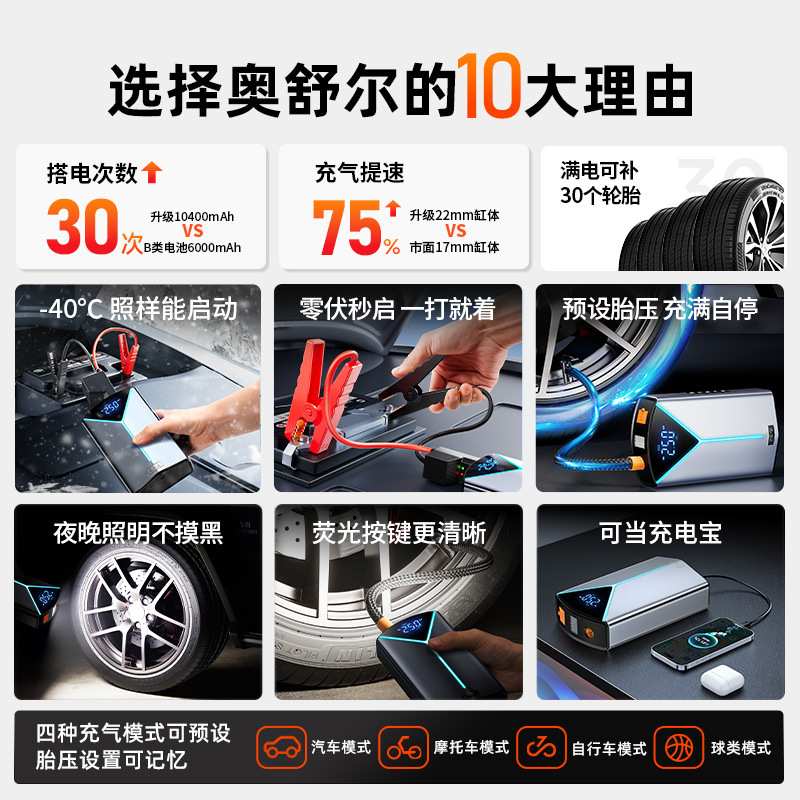 奥舒尔汽车应急启动电源车载充气泵搭电宝多功能搭电打气泵一体机
