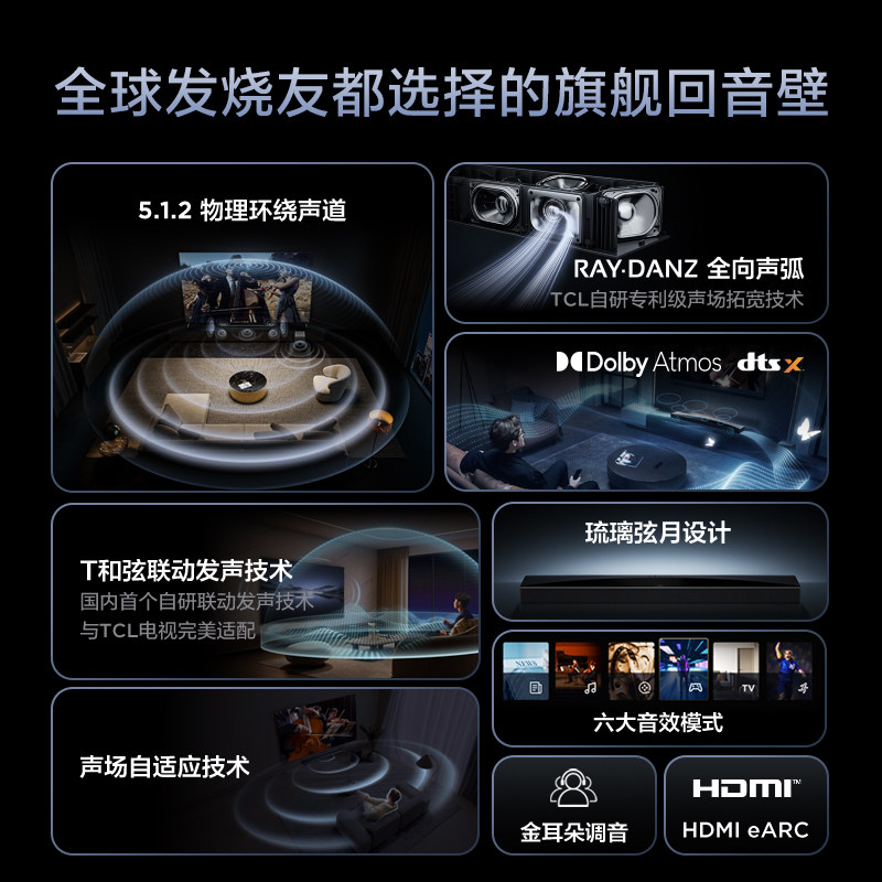 TCL回音壁 Q75H 5.1.2物理环绕声道 全向声弧 T和弦 杜比全景声