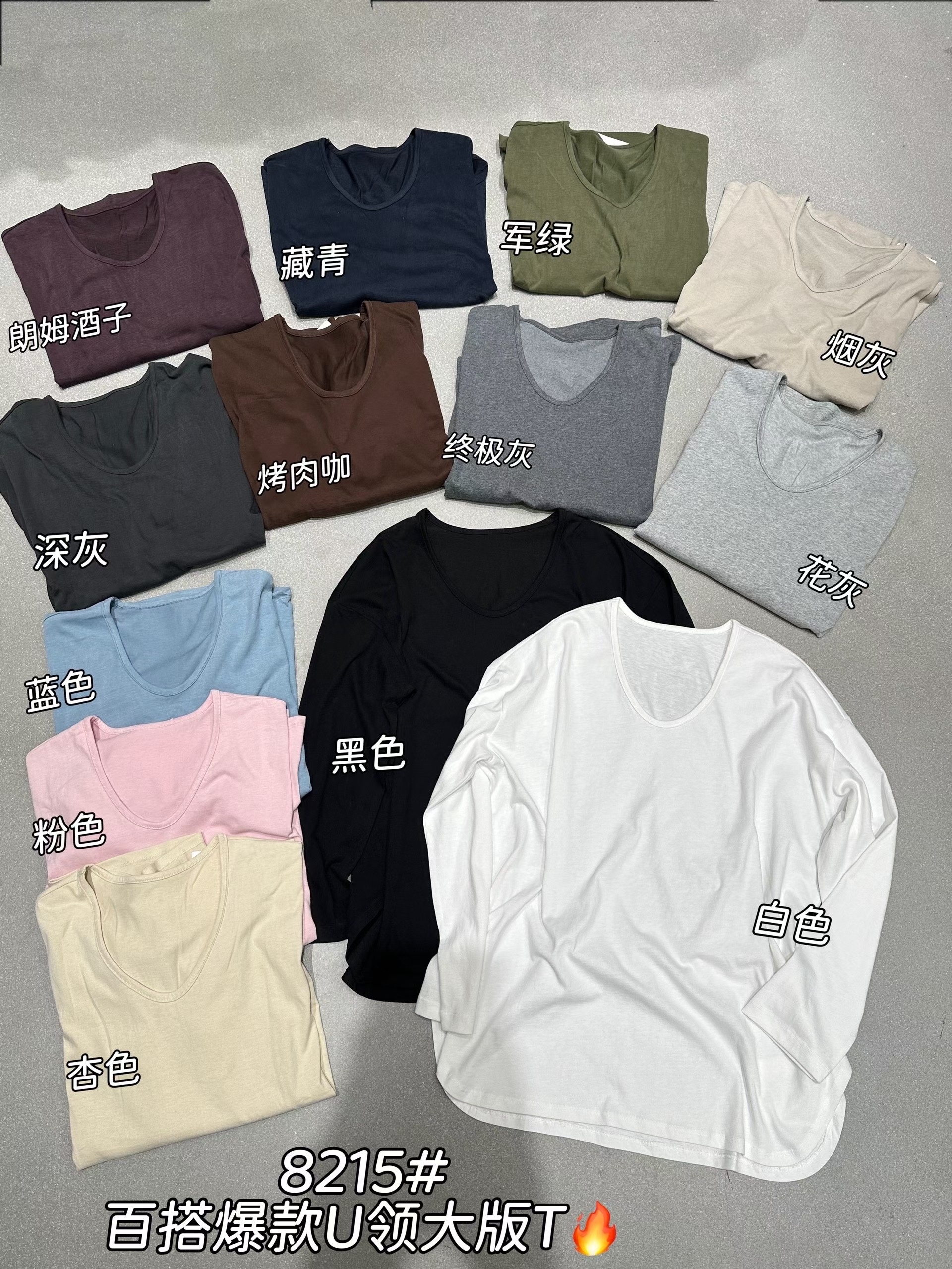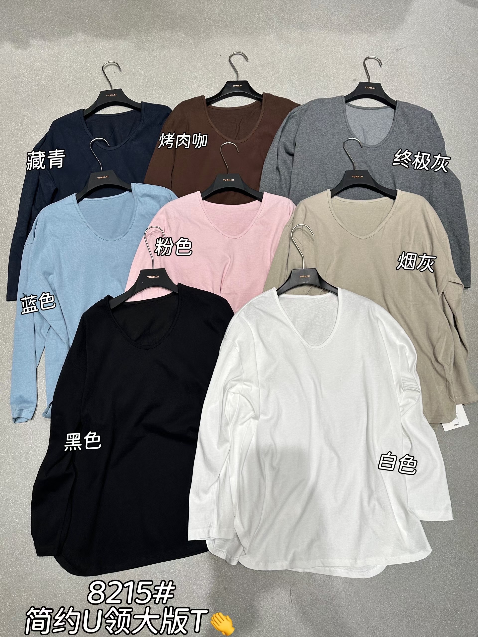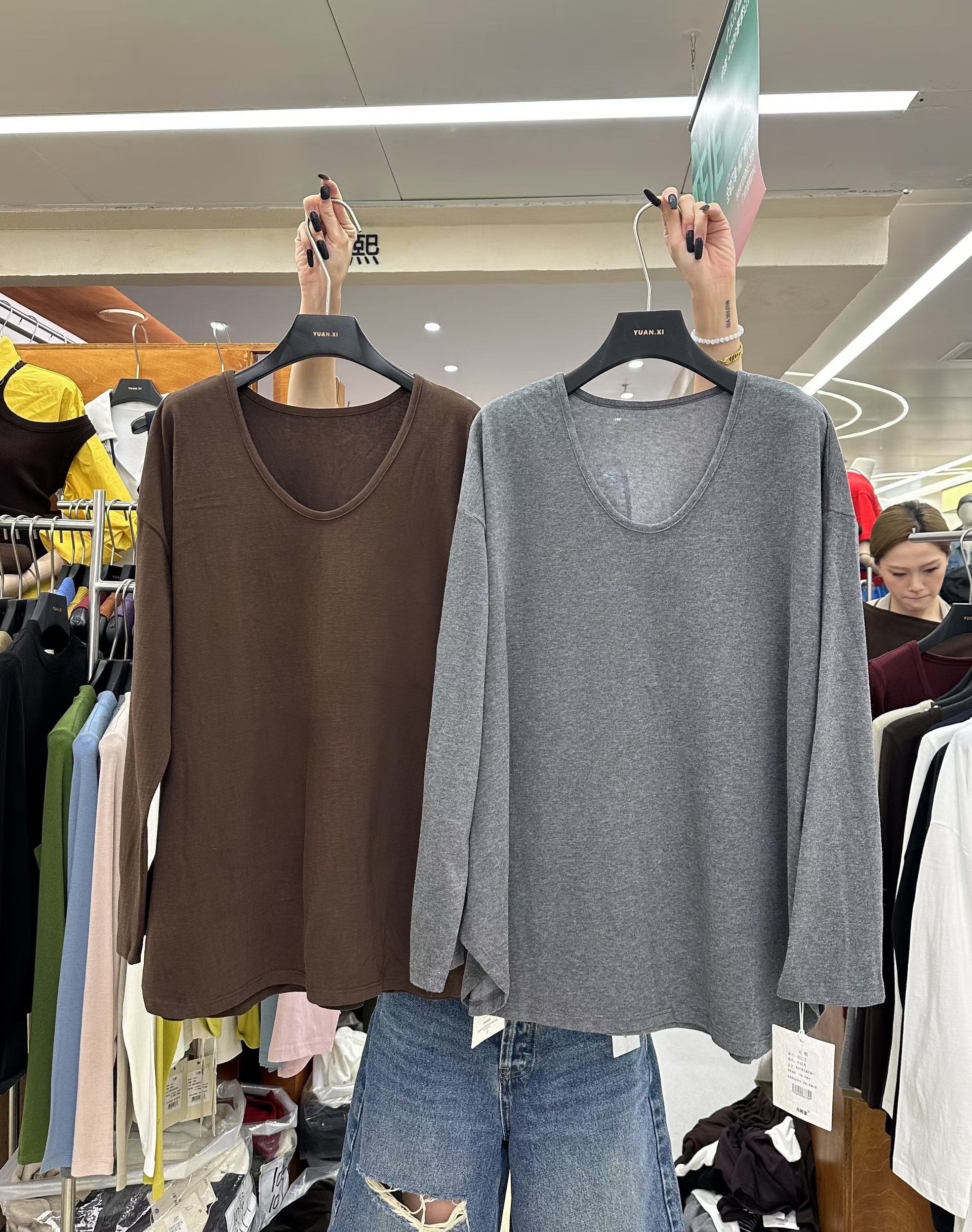 元熙8215韩版U领长袖T恤女2025秋冬新纯色简约宽松大版打底衫上衣