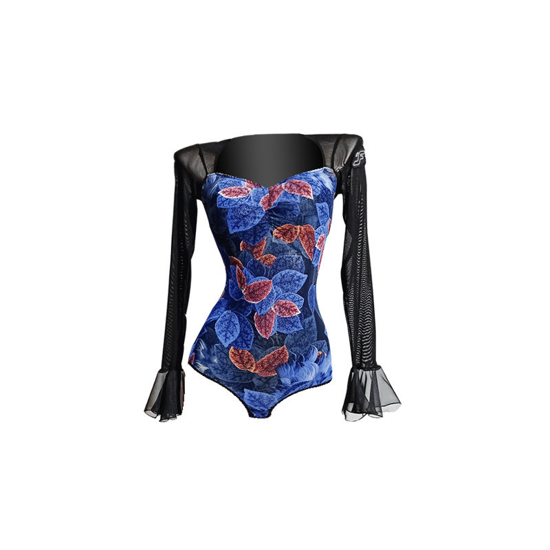 又见梵羽冬季国标舞上衣女 长袖印花拉丁服 撞色摩登连体衣TL635